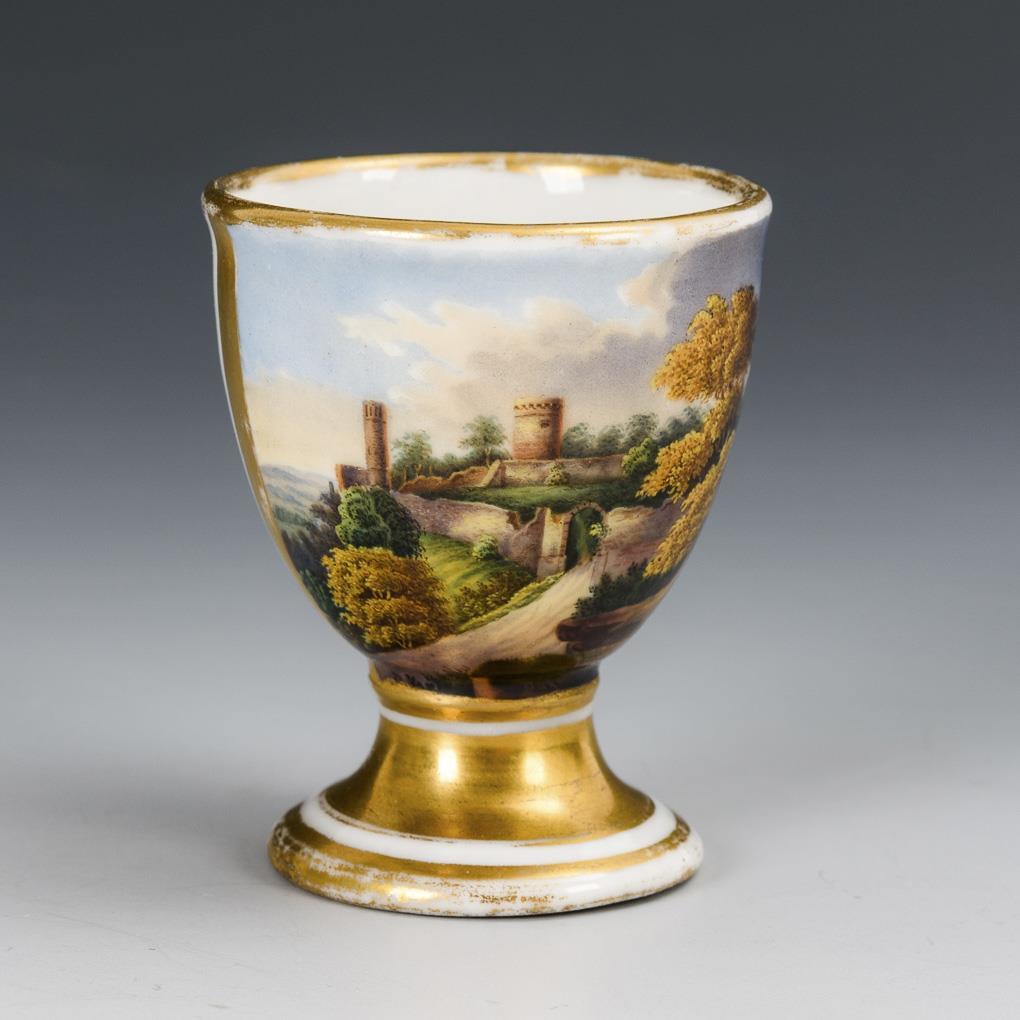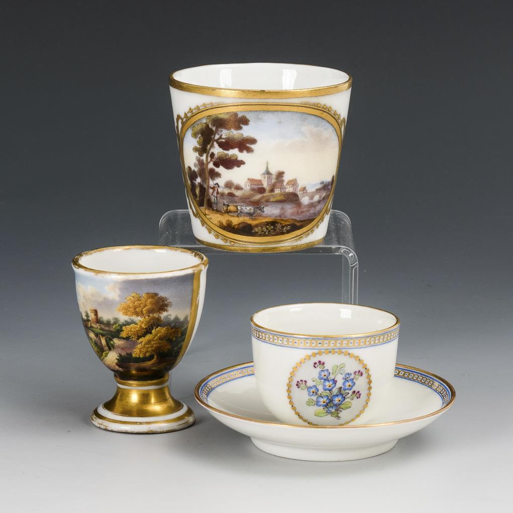 1x konische Tasse mit gewinkeltem Henkel: schauseitig ein goldgerahmtes Medaillon, darin eine fein gemalte Flusslandschaft mit Dorf, Kühen und Kuhhirten (H 5,5 cm). / 1x Eierbecher mit der Ansicht einer Landschaft mit Burgruine (H 5,5 cm). / 1x kleine Tasse (H 3,5 cm) mit Untertasse (Ø 8,5 cm): mit blau-goldener Ornamentbordüre sowie einem schauseitigen Medaillon mit Vergißmeinnichtbukett. Gold des Eierbechers etwas berieben.