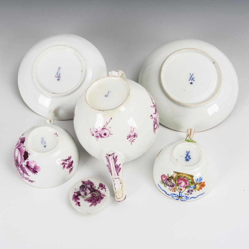 1x um 1750: Teekännchen mit purpurfarbener Blumenmalerei (H 11 cm). / 2x Marcolini-Zeit, Ende 18. Jh.: 2 bauchige Tassen mit farbiger bzw. purpurfarbener Blumenmalerei (H Tassen 4,5 cm, Ø originale Untertassen 12 cm). Teekännchendeckel, -schneppe und -stand restauriert, partieller Goldabrieb.