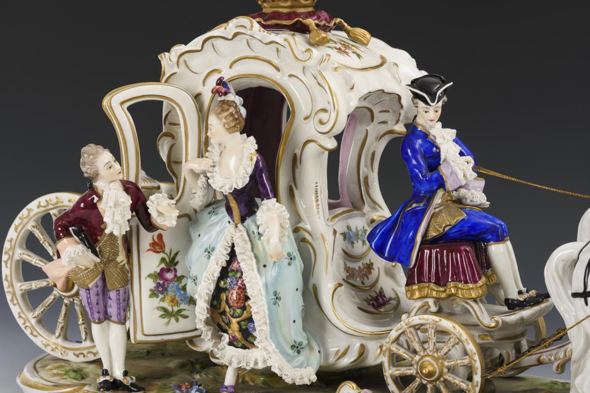 Zweispännige Rokokokutsche mit Kutscher sowie einer aus der Kutsche aussteigender Dame. Minimale Bestoßungen an der Spitze.