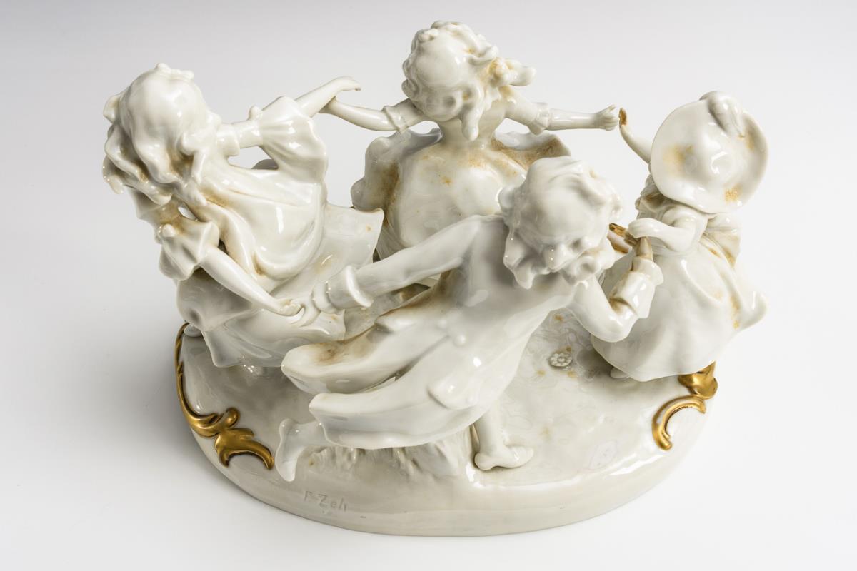 Vier, miteinander einen Reigen tanzende Rokokokinder. Goldabrieb.