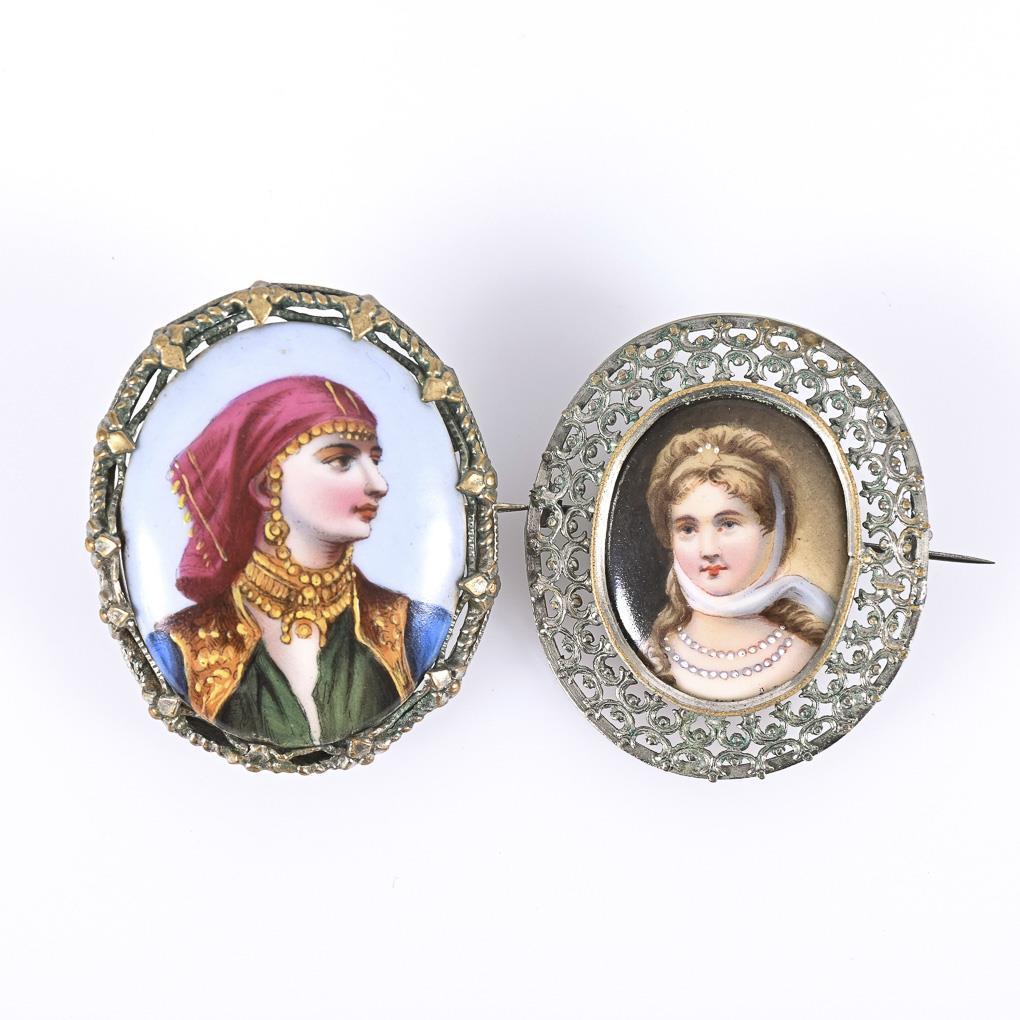 2 Broschen mit Miniaturen.