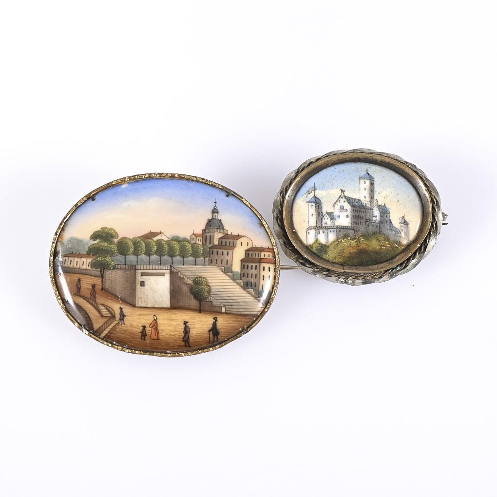 2 Broschen mit Miniaturen.