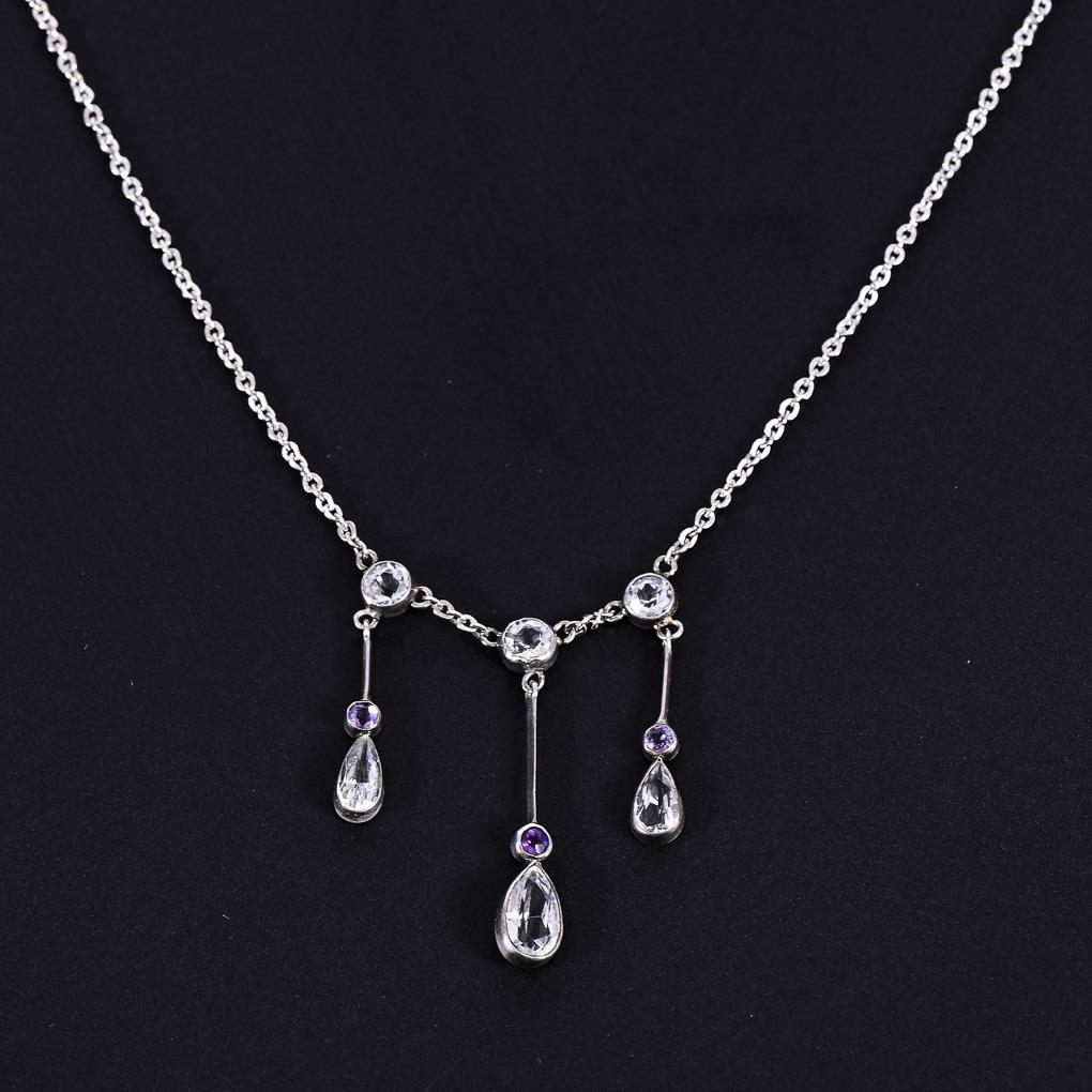 Art-déco-Kette mit hellblauen, farblosen und amethystfarbenen Steinen.