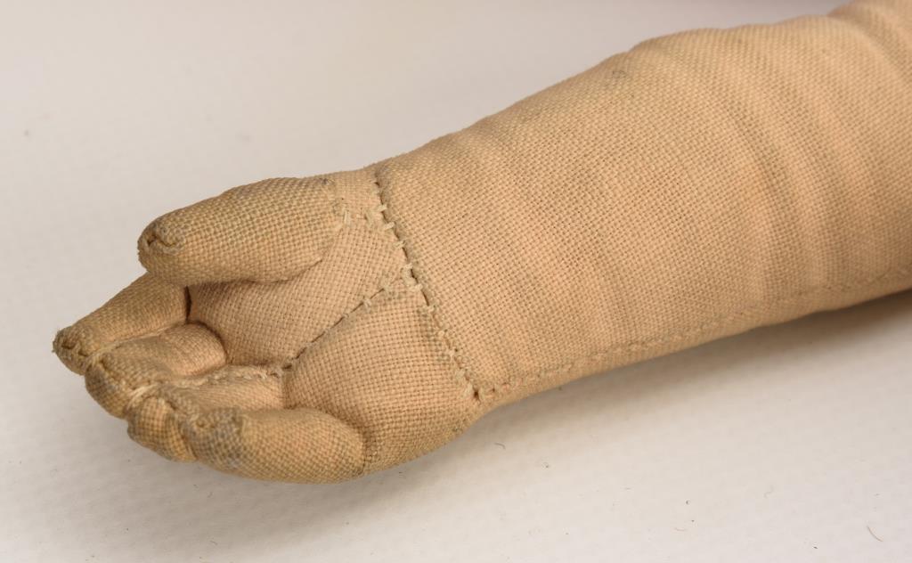Festgenähter Stoffkopf mit 3 Hinterkopfnähten, bemalter Gesichtsmaske und 2 Nähten an den Mundwinkeln. Im Nackenbereich unbemalt. Körper mit einzeln angenähten Daumen, je 2 Nähten an Brust und Rücken sowie je 5 Beinnähten. Rot gemusterter Spielanzug, karierte Jacke, roter Cordhut. Farbabrieb am Hinterkopf, Retuschen an Nase und Mund, Körper verschmutzt.