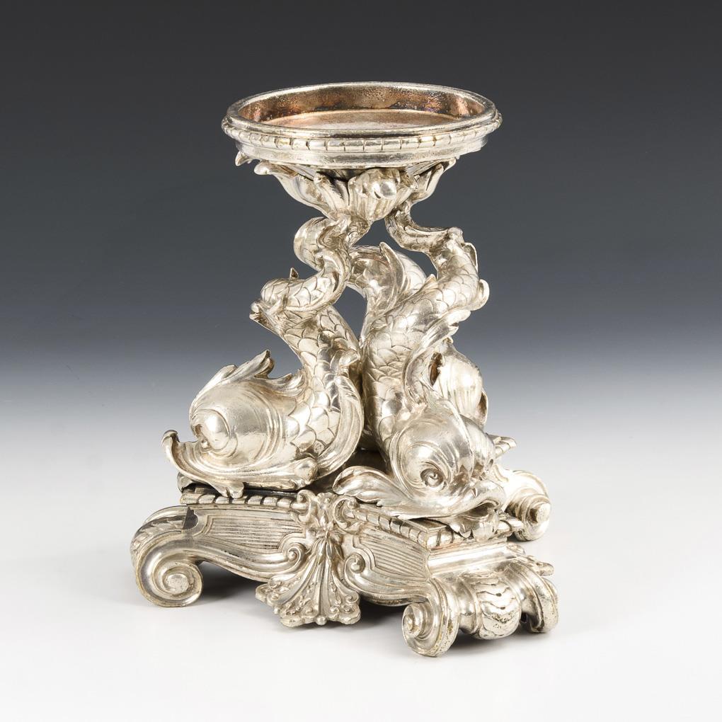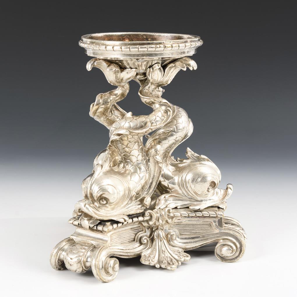 3-seitiger Volutenfuß mit vollplastischen Delphinen, deren verschraubten Hinterleiber die Schalenhalterung tragen.