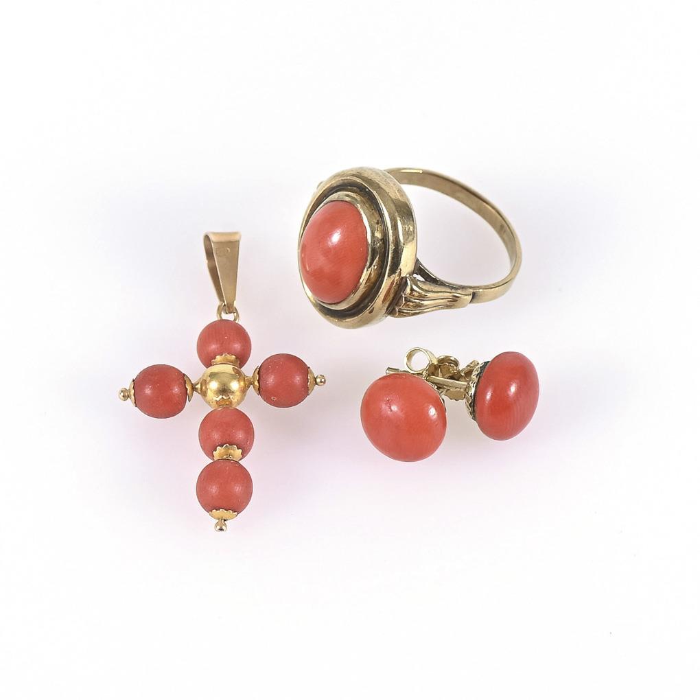 Ring, Ohrsteckerpaar und Kreuzanhänger mit Korallen. Schmale Schiene, Steckmechanik .