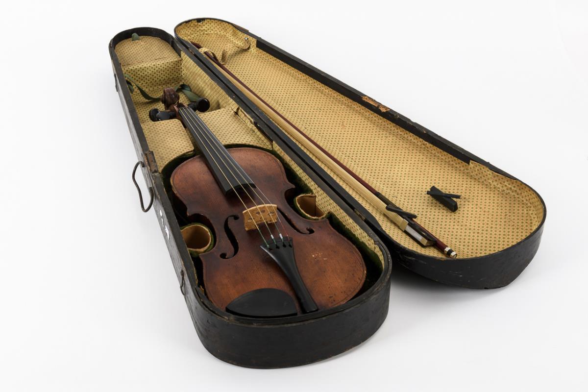 3/4-Violine mit geteiltem Boden und Decke sowie Kinnschutz. Dazu ein neuer Bogen. Geige alt restauriert, restaurierungsbedürftig. Kasten starke Alters-/Gebrauchsspuren.