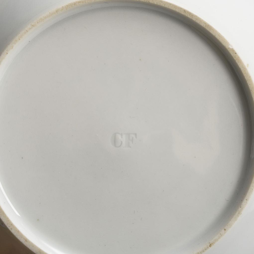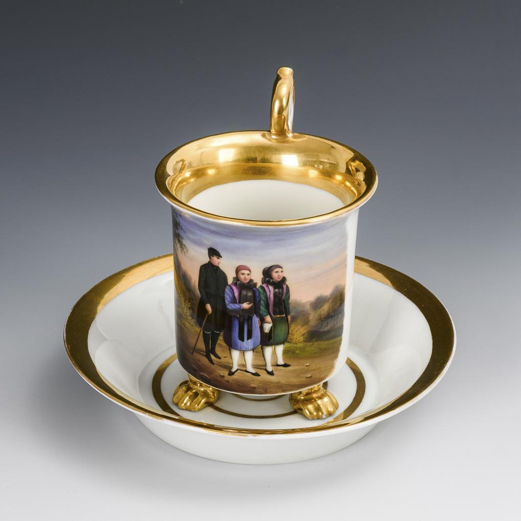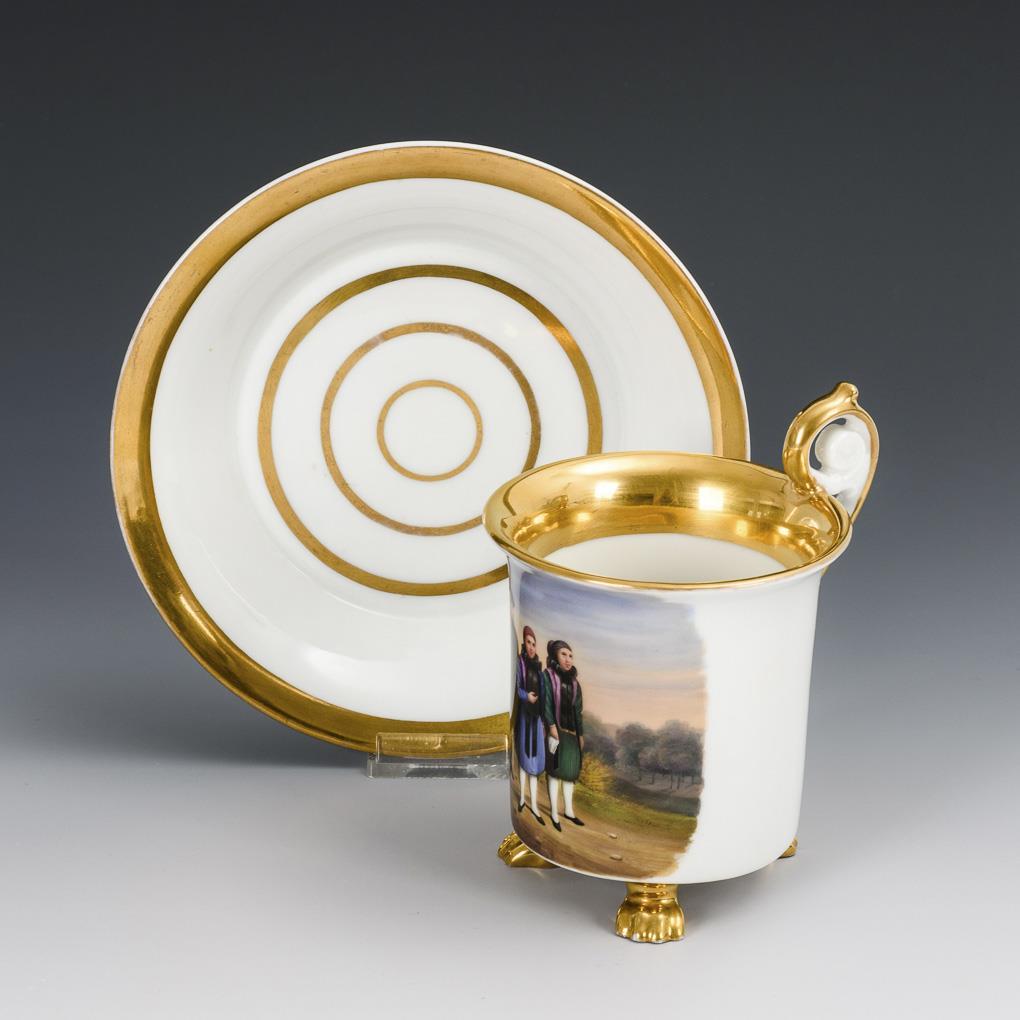 Kratertasse mit drei Tatzenfüßen und Rosettenhenkel. Schauseitig die Darstellung eines jungen Bauern und zwei jungen Frauen in Altenburger Tracht. 3 kleine Bestoßungen an den Tatzenfüßen, Haarriss am Untertassenrand.