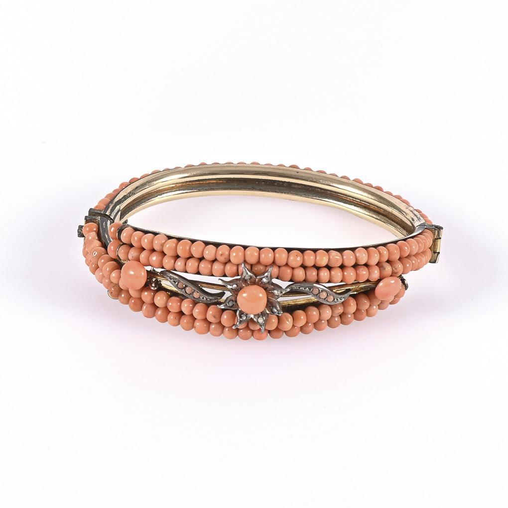 Ovaler Klappreif mit aufgezogenen Korallenkugeln. Mittig Montierung mit Korallenlinsen und Perlchen. Kastenschloss mit Achtersicherung.