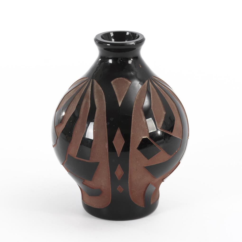 Bauchige Vase mit tief ausgeätztem, geometrischem Dekor.