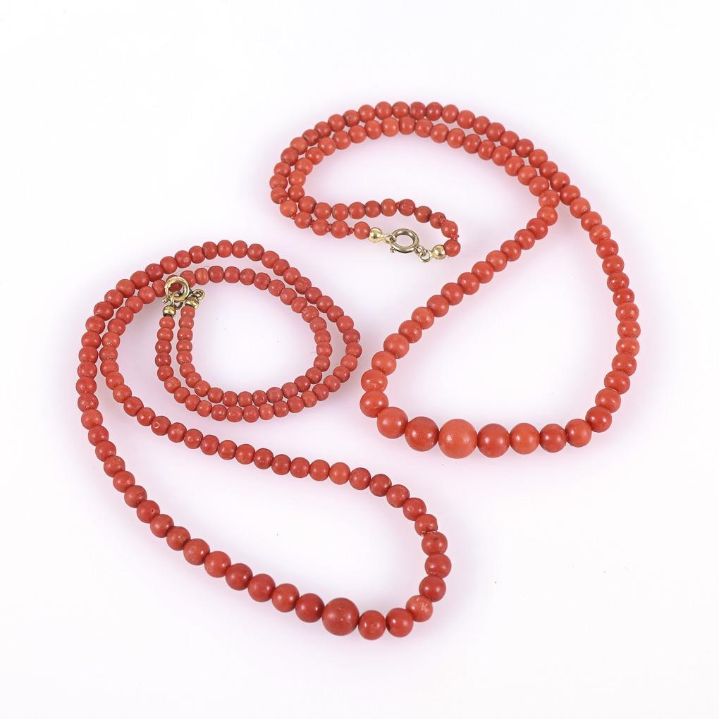 Schnürketten mit Korallenkugeln im Verlauf, an Metall-Ringfederschließen.