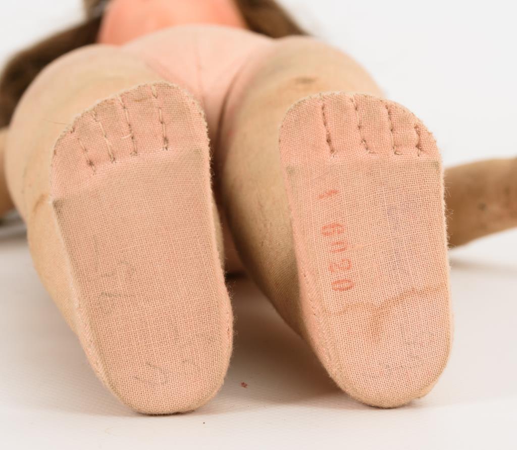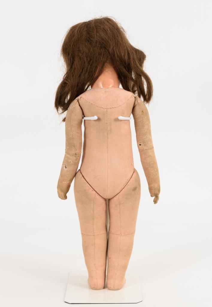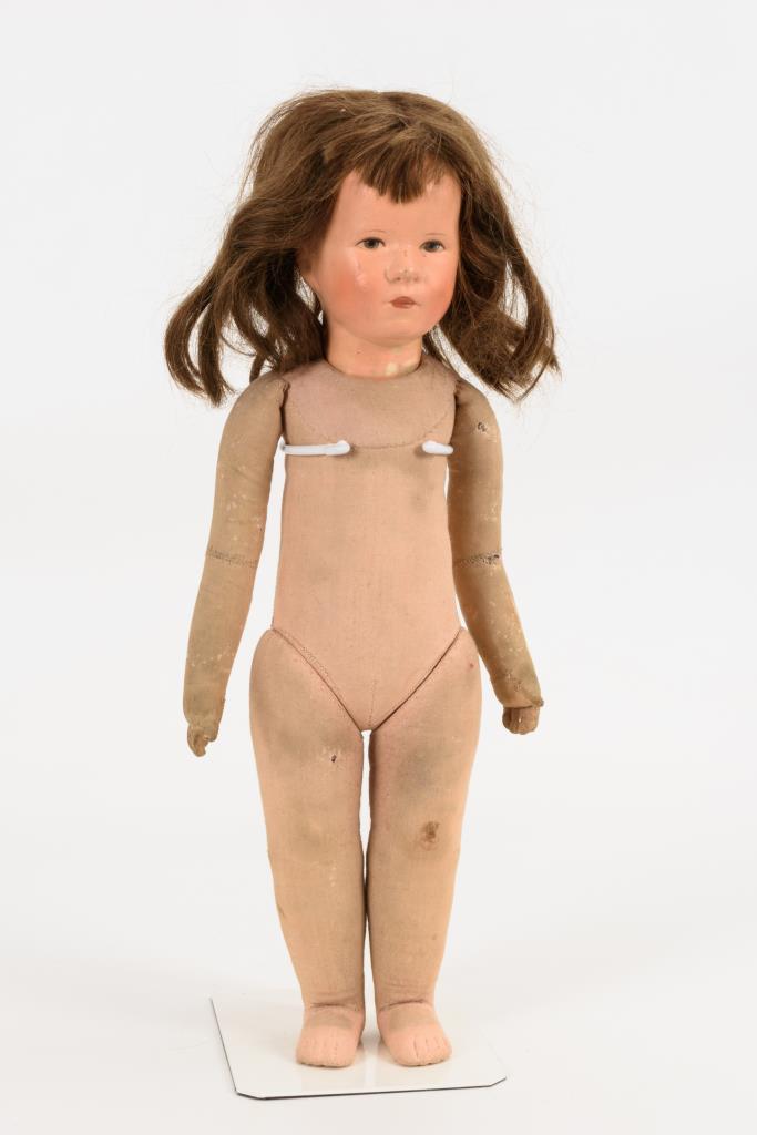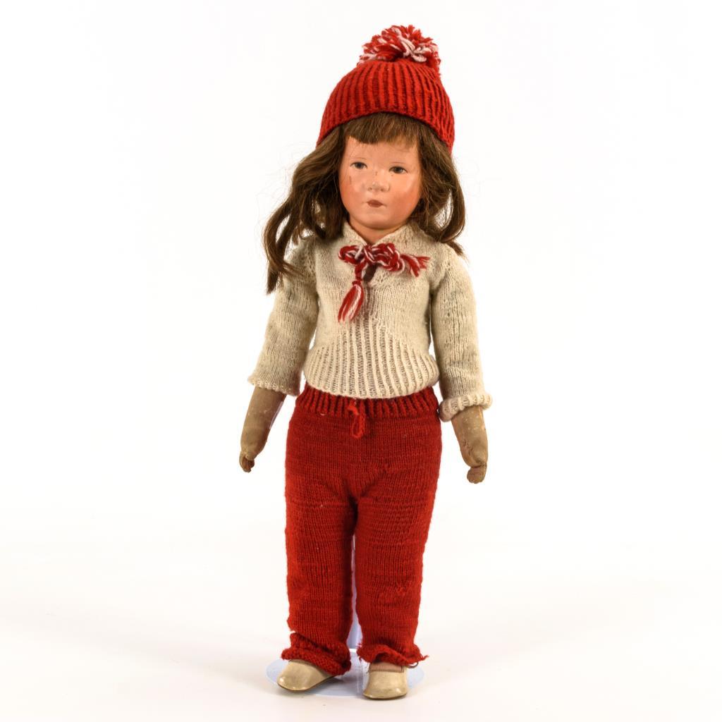 Bemalter, mit Stoff überzogener Kurbelkopf, Echthaarperücke, Stoffkörper. Rot-weiße Strickkleidung, Pudelmütze. Gesicht mit kleinen Farbdefekten, Körper verschmutzt, mit Löchern.