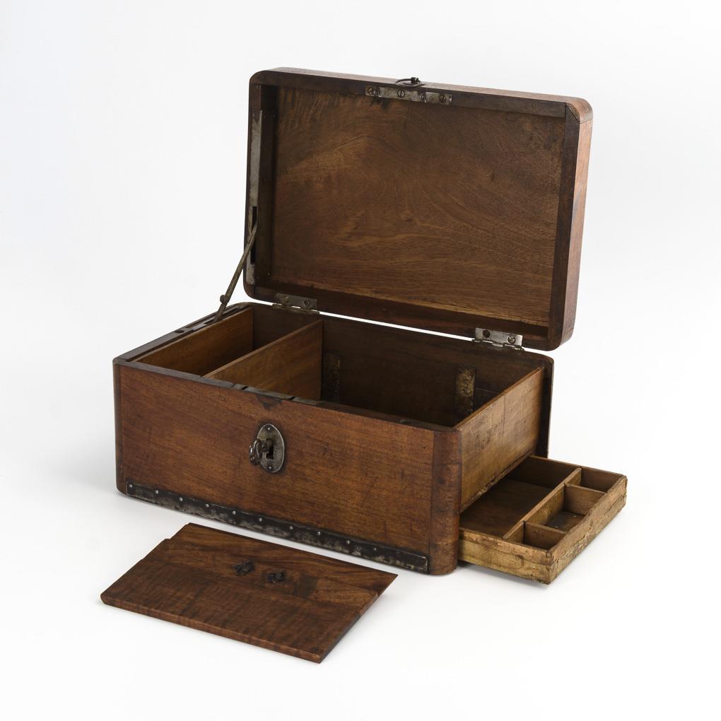 Quaderschatulle mit Beschlägen und seitlichen Tragegriffen sowie Kantenverstärkungen unten. Scharnierdeckel mit integrierter Haltestrebe sowie 2 Bodenverschraubungen in den Seitenwänden. Fachung innen und Geheimfach. Restauriert mit meist kleineren Ergänzungen, Alters-/Gebrauchsspuren.