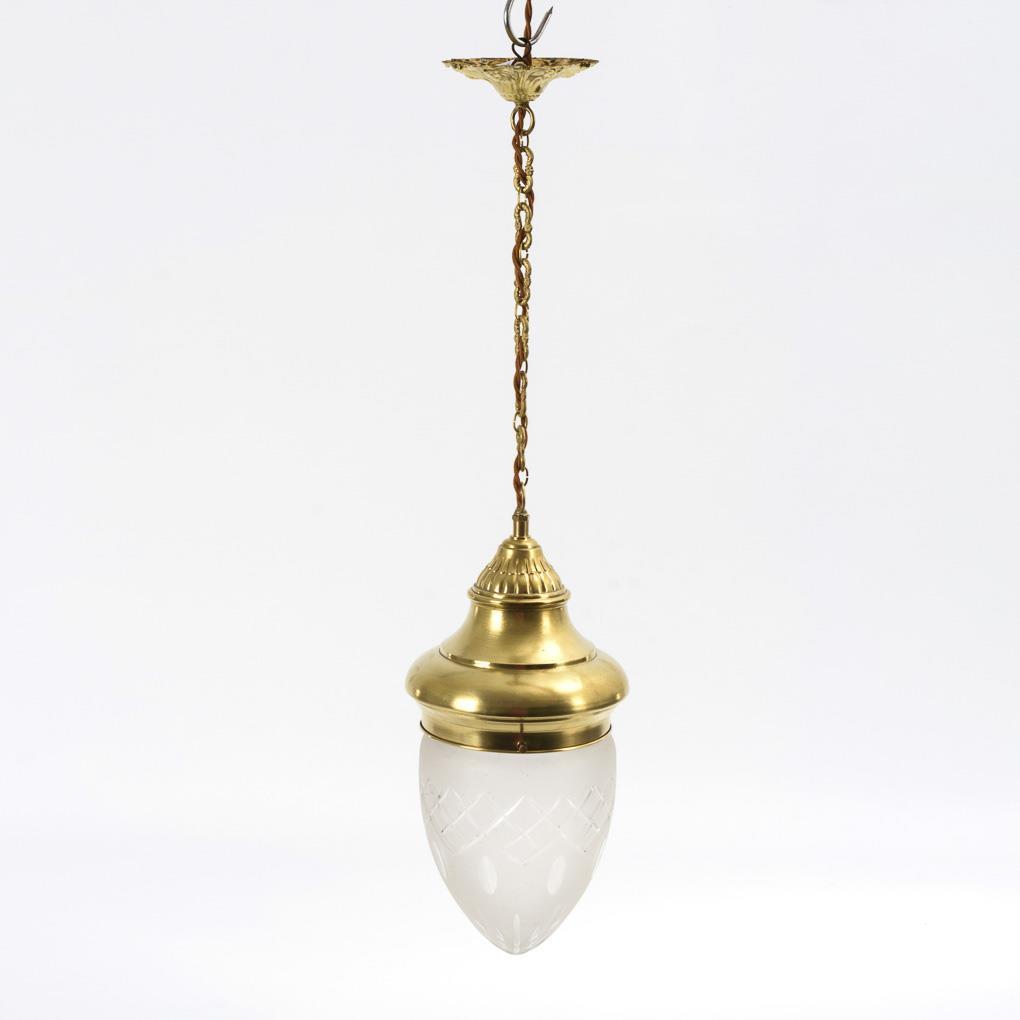 1-flammige Hängelampe an Kettenaufhängung mit Akanthusblattbaldachin und glockenförmiger Fassung, zapfenförmiger Glaskörper mit Kerbschliffdekor. Leichte Alters-/Gebrauchsspuren.