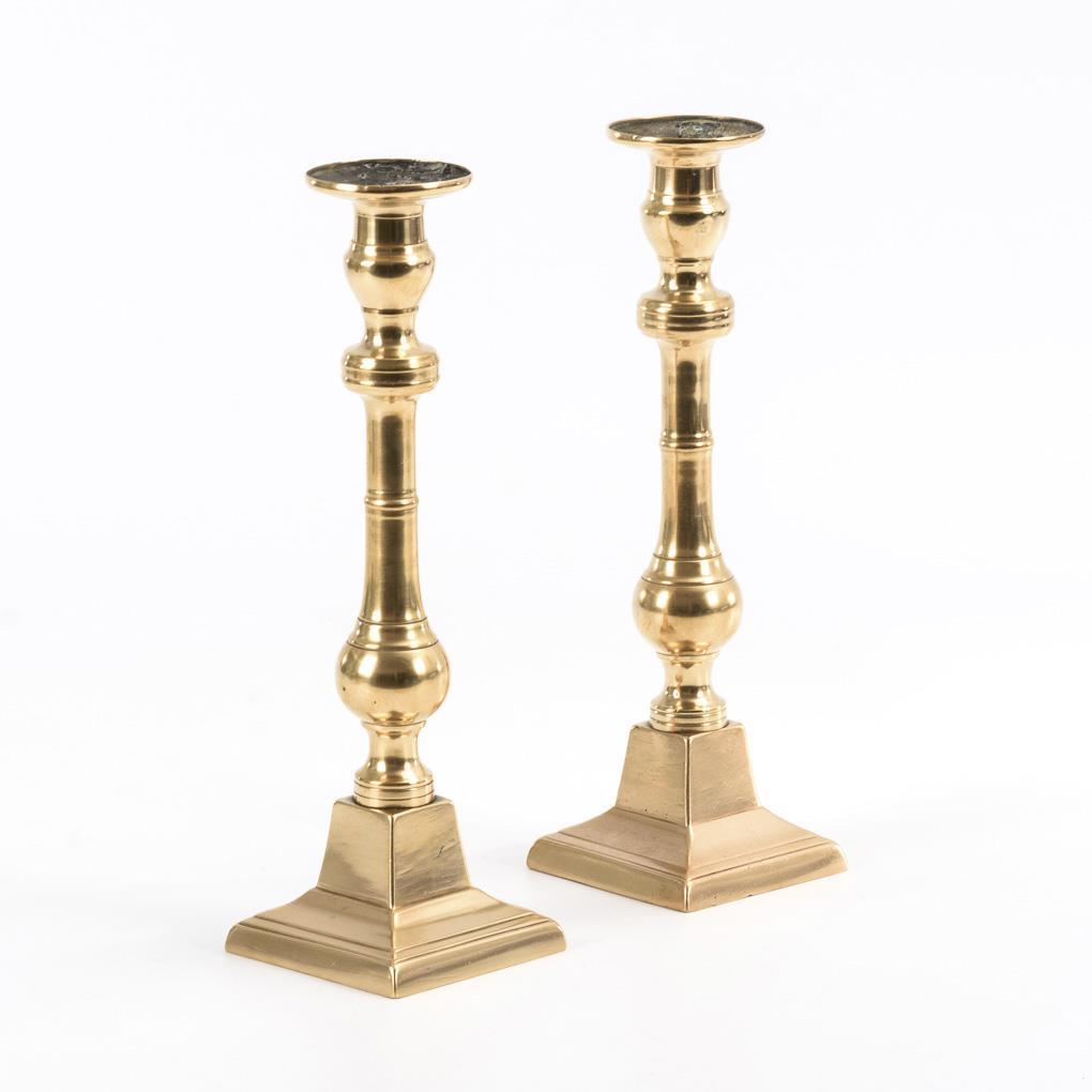 Bronzeleuchter mit hohem Quadratfuß und schlankem Balusterschaft. Kaum sichtbare Ausbesserungen an den Sockeln wohl von der Gießerei.