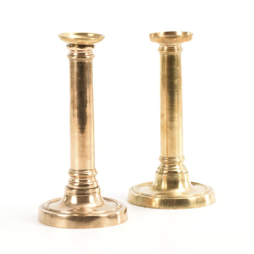 Schwere Leuchter in ähnlicher Säulenform mit hohlem Schaft. Messingleuchter mit kaum sichtbaren Ausbesserung am Fuß wohl von der Gießerei, je Alters-/Gebrauchsspuren.