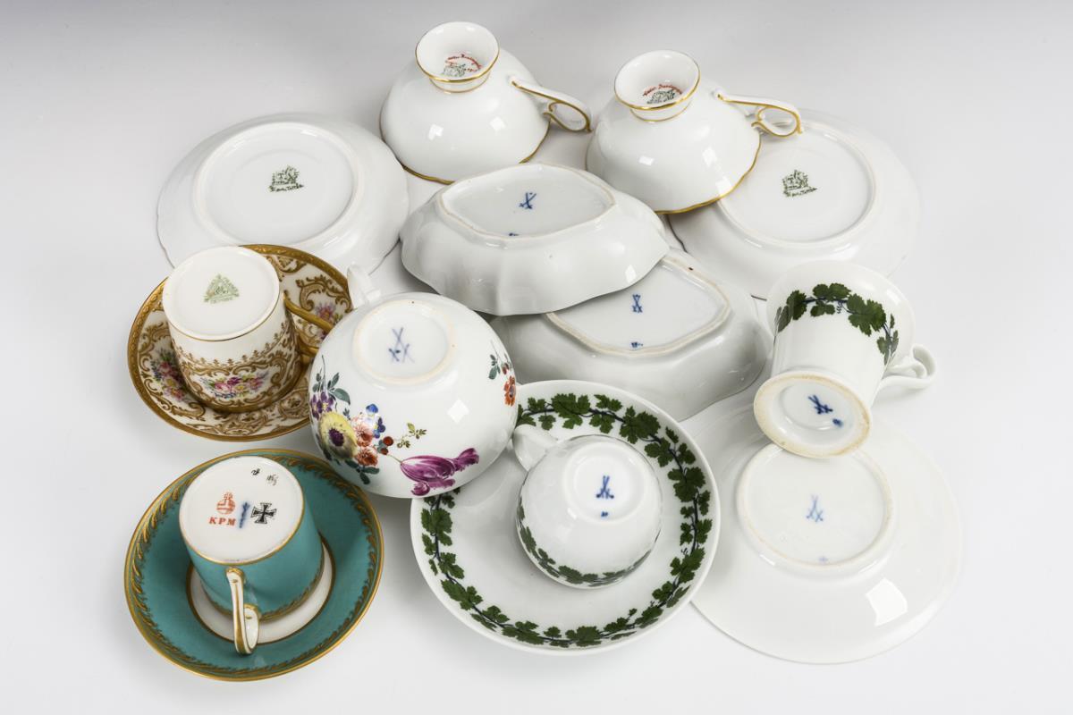 1x Meissen, um 1770: bauchige Tasse mit Blumenmalerei. / 6x verschieden gemarkt, 20. Jh. (KPM Berlin, Meissen, Tettau, Limoges): verschieden bemalt (Weinlaub, türkiser Farbfond, Blumenmalerei), alle mit Untertassen. / 2 Vierpassschälchen Meissen mit Weinlaubdekor.