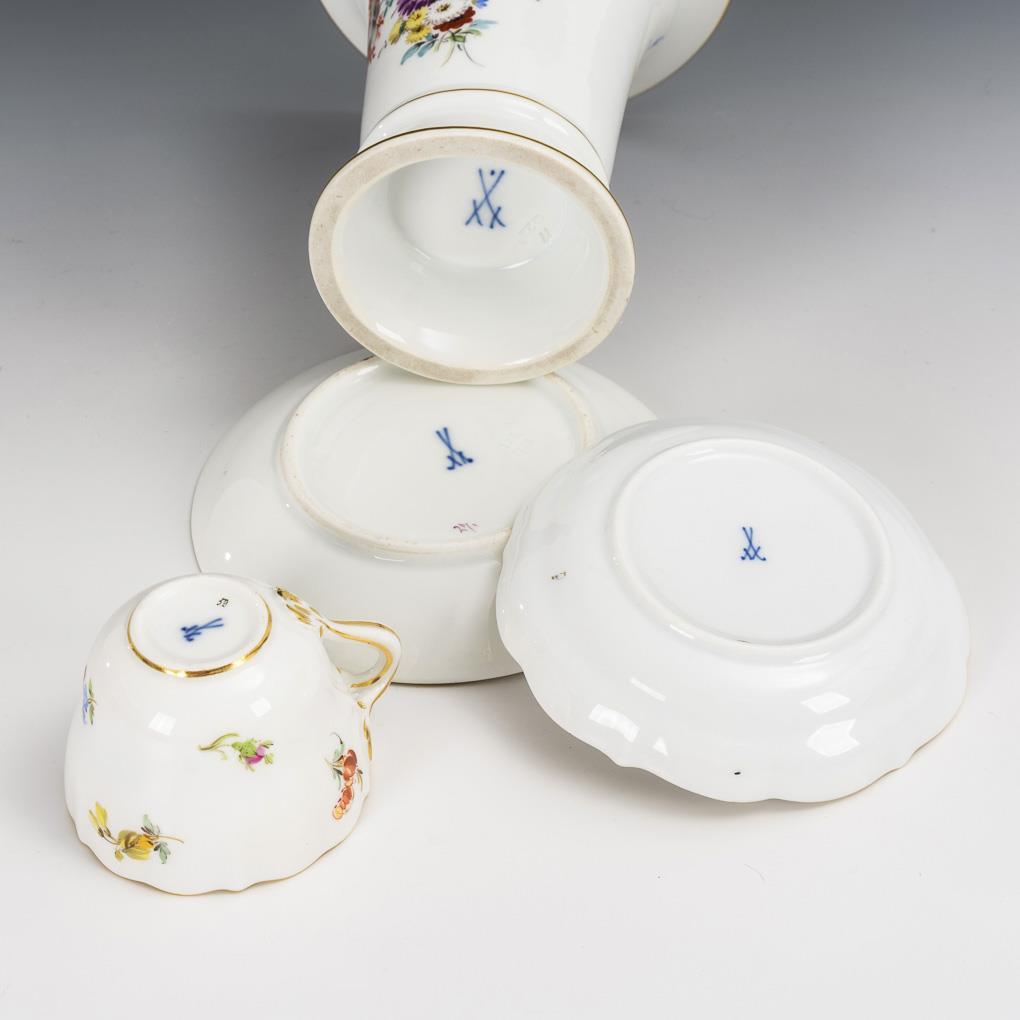 Kratervase, Mokkatasse und 2 Untertassen mit Blumenmalerei. Meissen.
