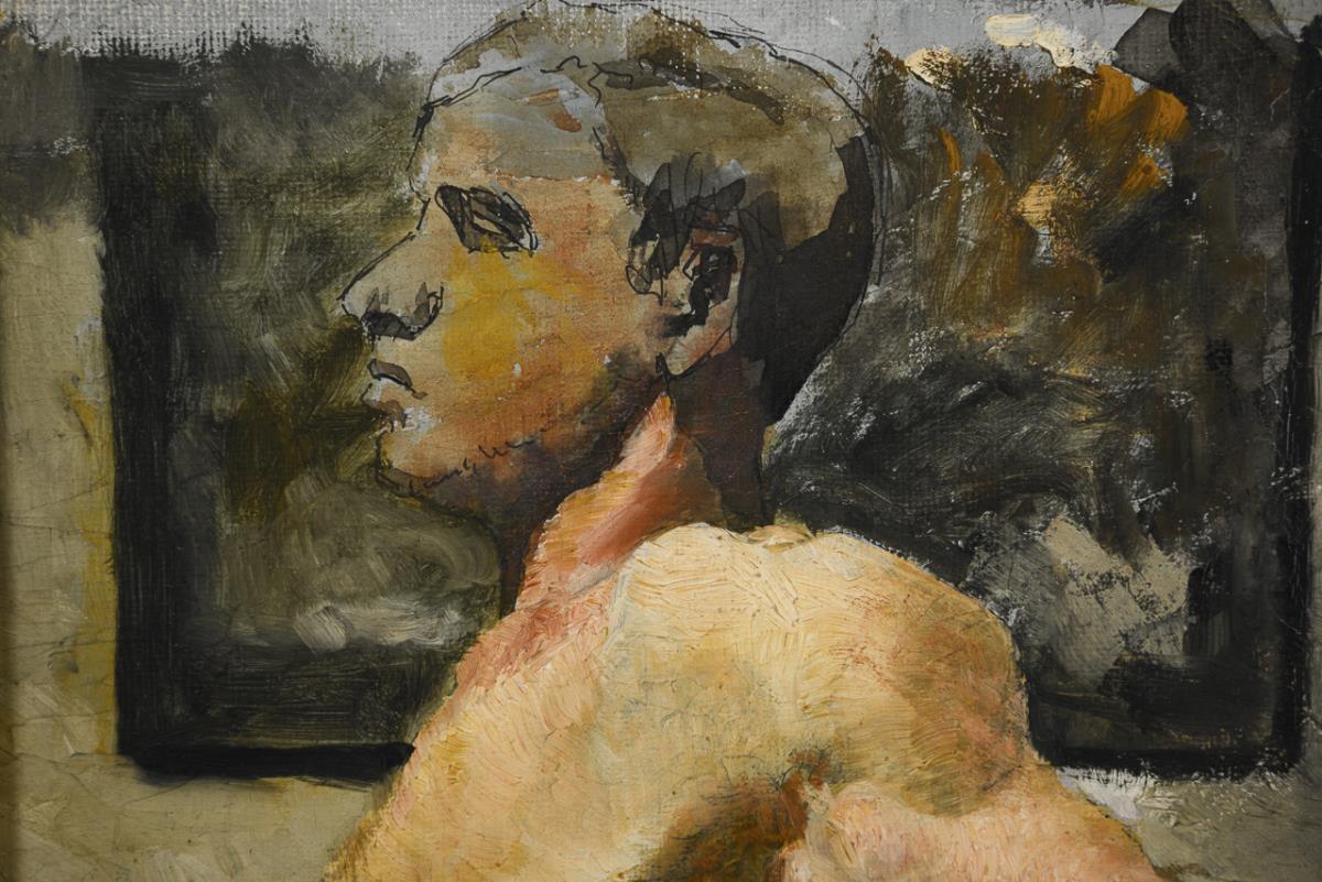 Nackter, sich aufstützender junger Mann mit skizzenhaft ausgeführtem Gesicht.
