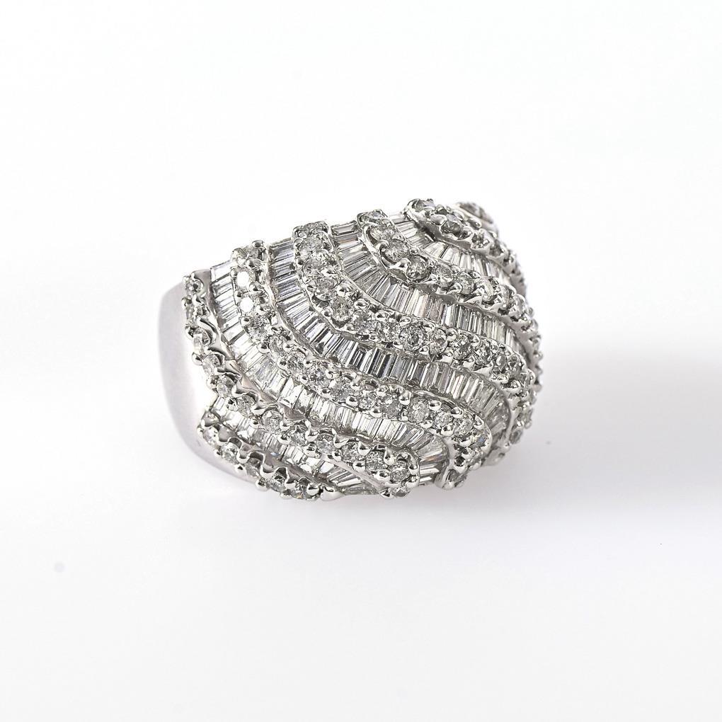 Breite Verlaufschiene, besetzt mit 86 Brillanten und 105 Diamantbaguetten.