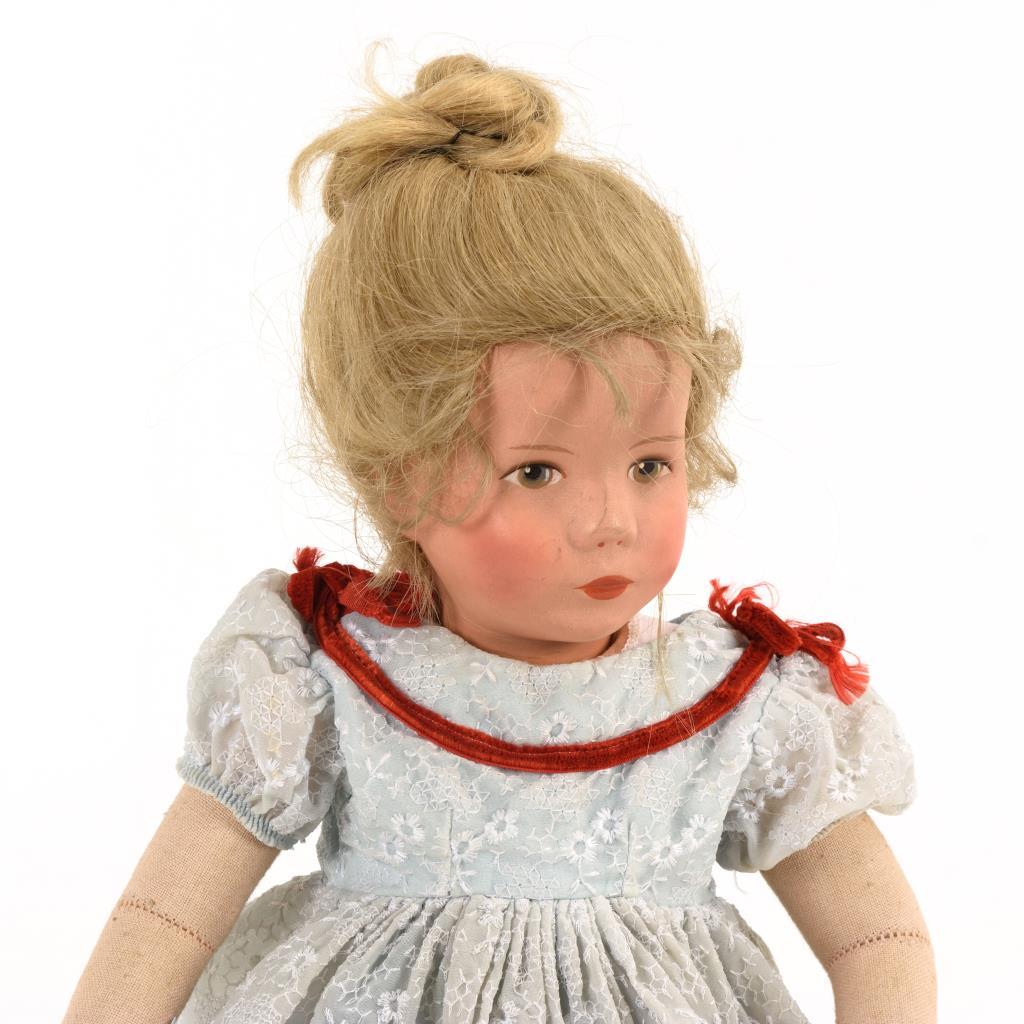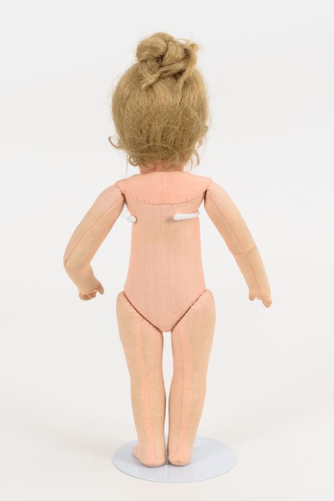 Kurbelkopf aus Kunststoff. Körper aus Nessel, mit Ellbogennaht. Hellblaues Kleid, rote Schuhe. Unbespielt, leicht verschmutzt.
