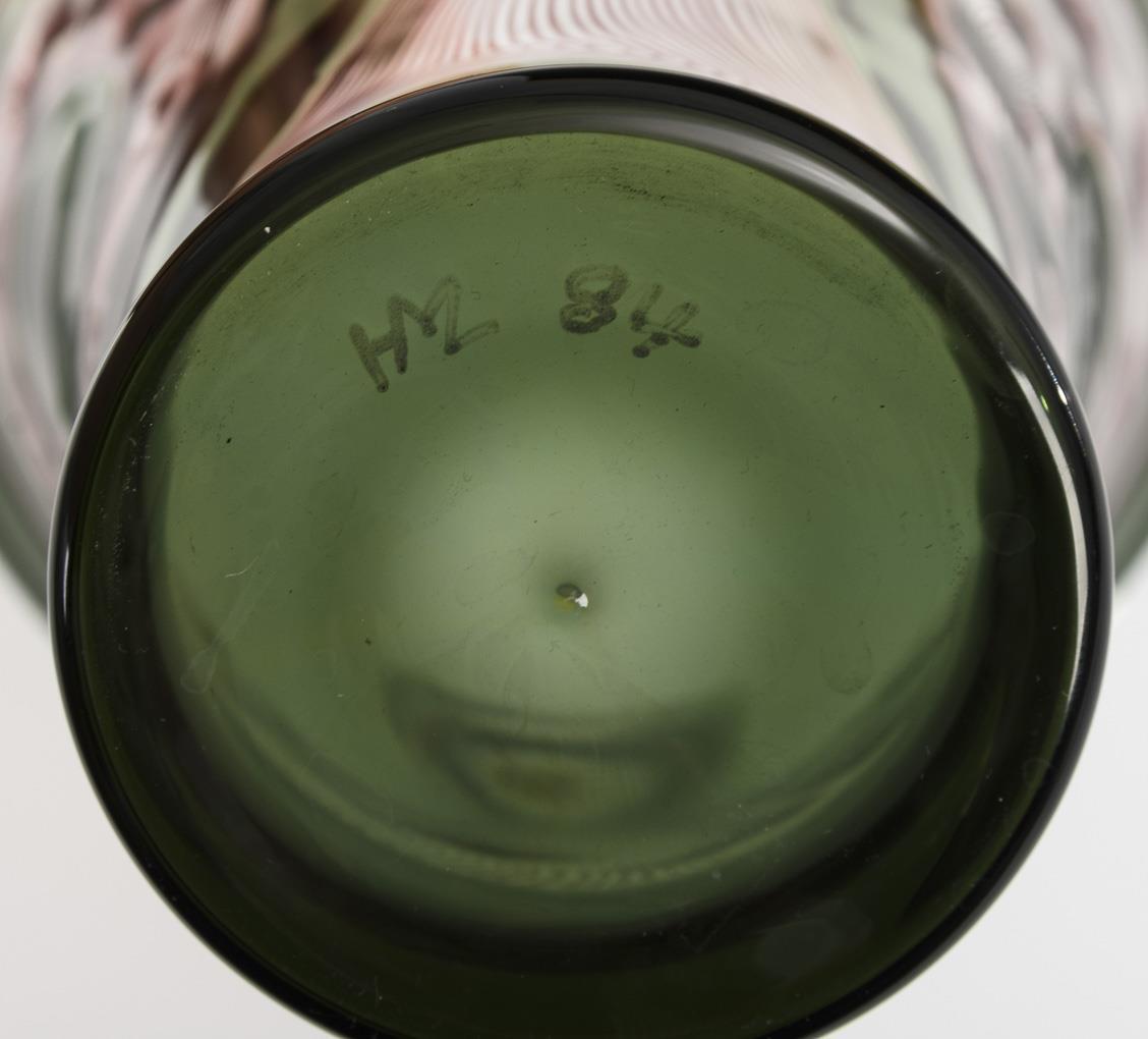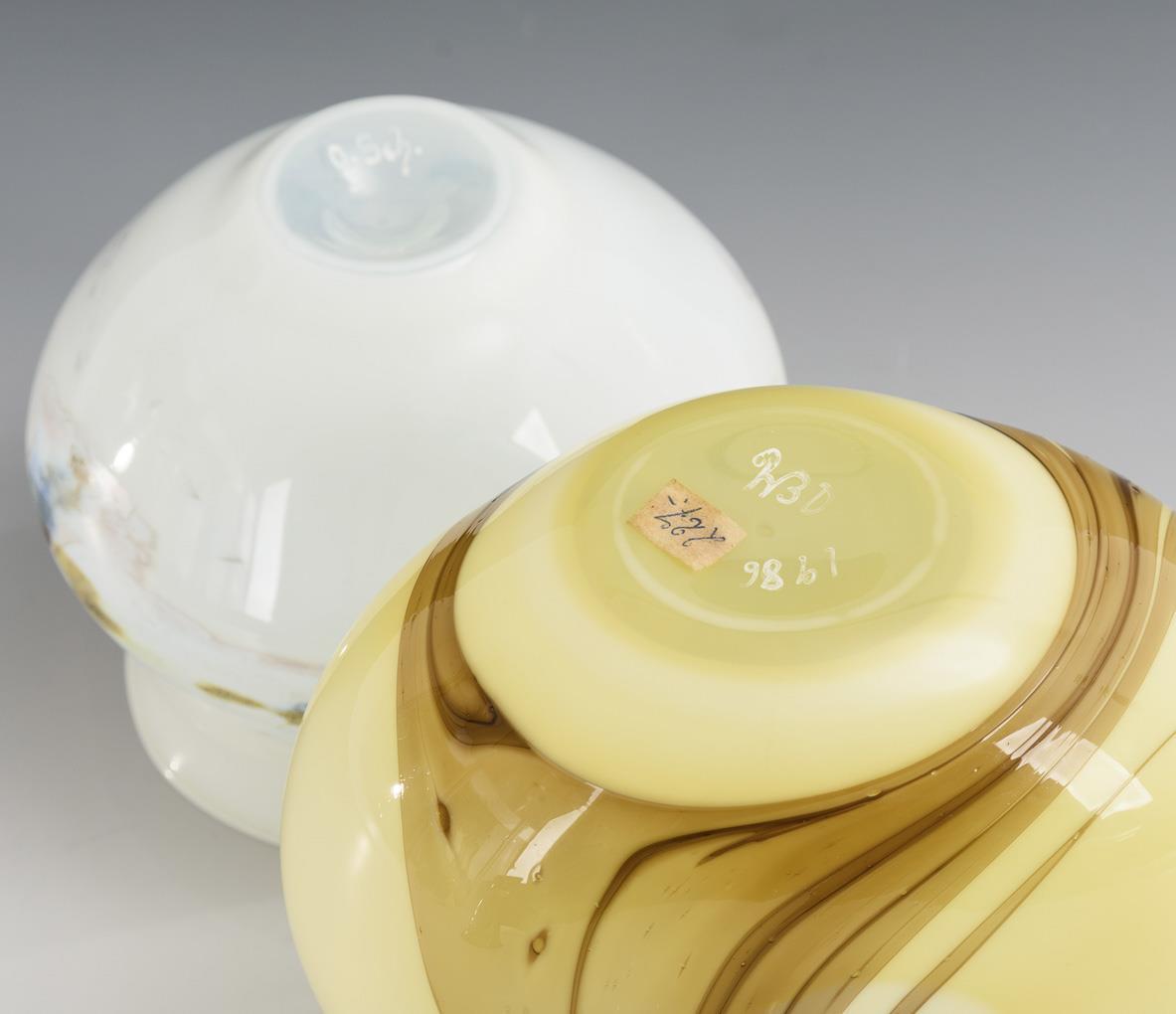 Lampengeblasenes Glas. 1x Horst Müller-Litz, signiert und datiert "HML 84": Kratervase aus grünem und farblosem, montiertem Glas mit violetter, spiralig verdrehter Fadeneinschmelzung im farblosen Glas (H 15 cm). / 1x Walter Bäz-Dölle, signiert und datiert "WBD 1986": bauchige Vase aus farblosem Glas mit opalgelbem Innenfang und montiertem, schlierig verzogenem braunen Glas (H 13 cm). / 1x Otto Schindhelm, signiert "O.Sch.": Kratervase aus farblosem Glas mit opalweißem Innenfang sowie einem umlaufenden Band aus Milchglasaufschmelzungen und farbigen Emailaufschmelzungen (H 10 cm).