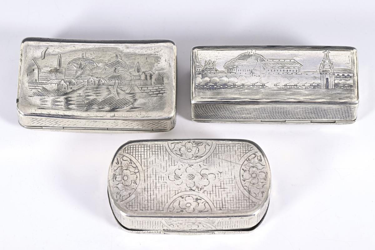 Schmale, fein gravierte Döschen. Gebrauchsspuren, teils etwas abgegriffen.