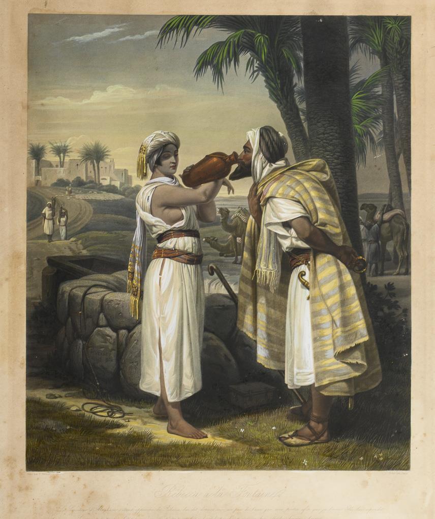 Rebecca am Brunnen - nach einem Gemälde von Horace Vernet (1789 - 1863). Stockfleckig, am rechten Rand mit eingerissener Stelle.