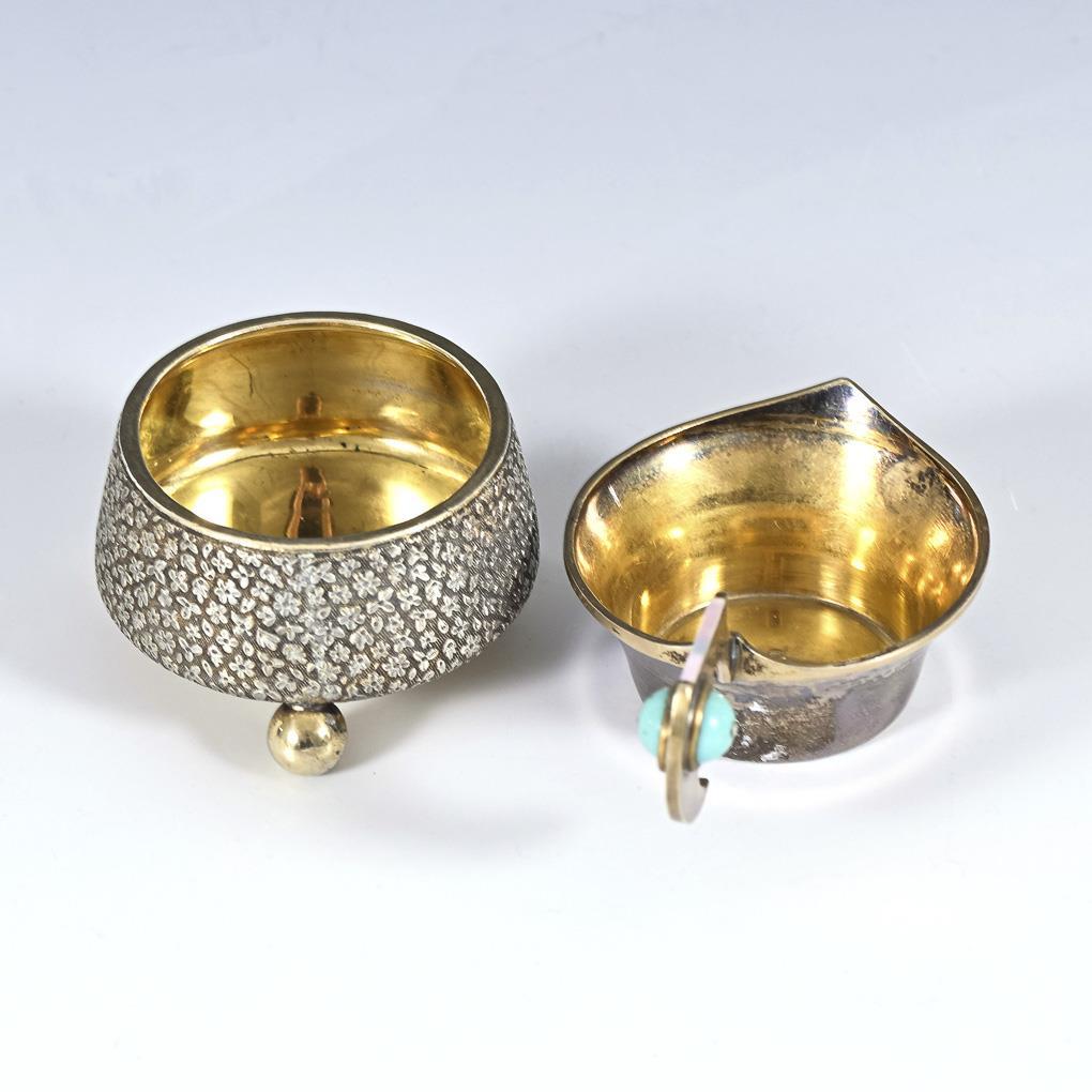 Salzschälchen mit Blütendekor und Monogrammgravur ES. / Kleiner Gießer, verziert mit 2 Türkis-Cabochons und kleinem Granat. Gebrauchsspuren, 1 Fuß etwas gestaucht.