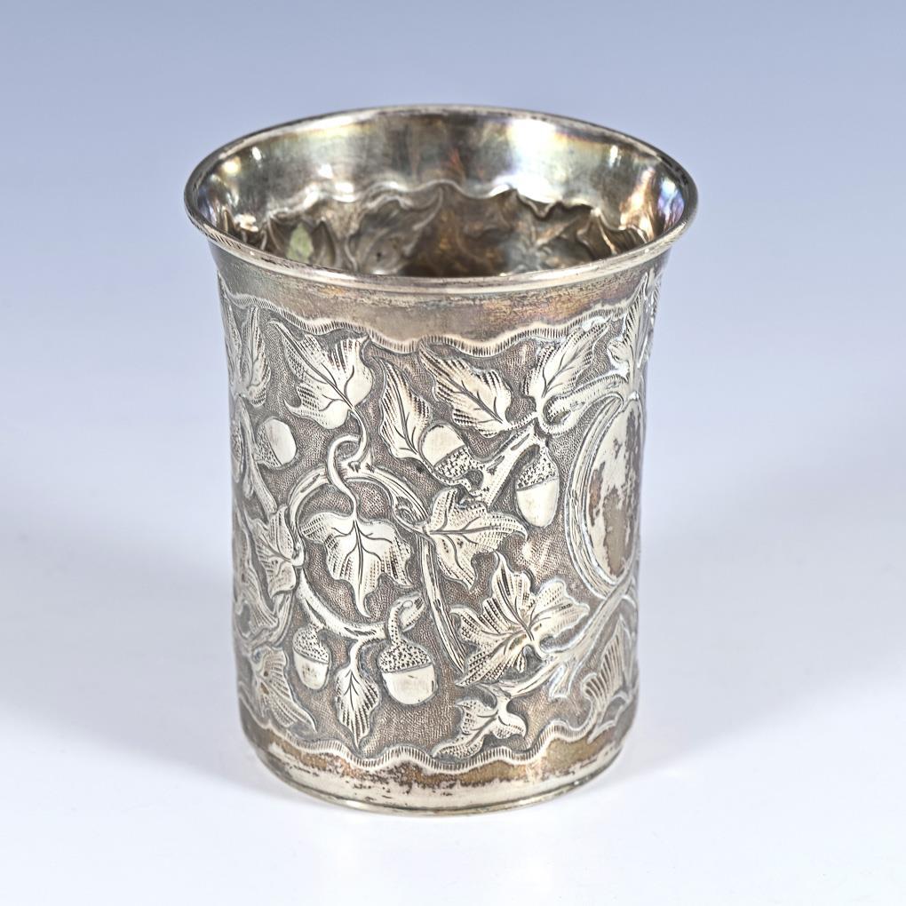 Reliefierter Becher mit Eichenblattranken und 2 unbeschrifteten Kartuschen. Leichte Gebrauchsspuren.
