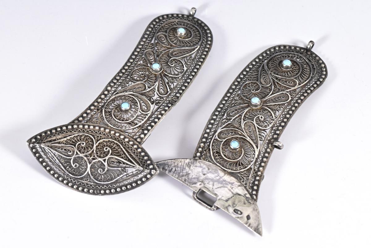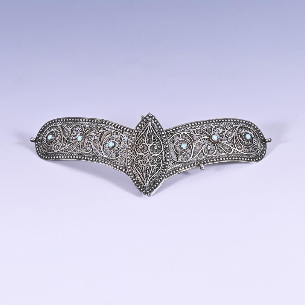 Fein gearbeitete Gürtelschnalle mit 6 kleinen Türkis-Cabochons.
