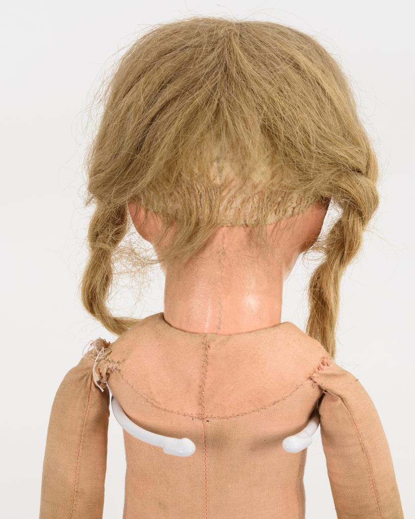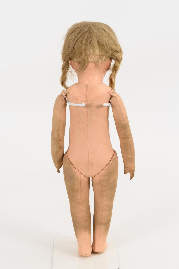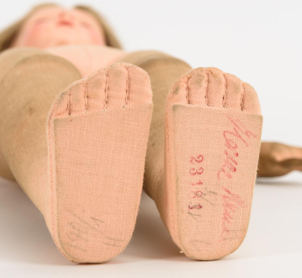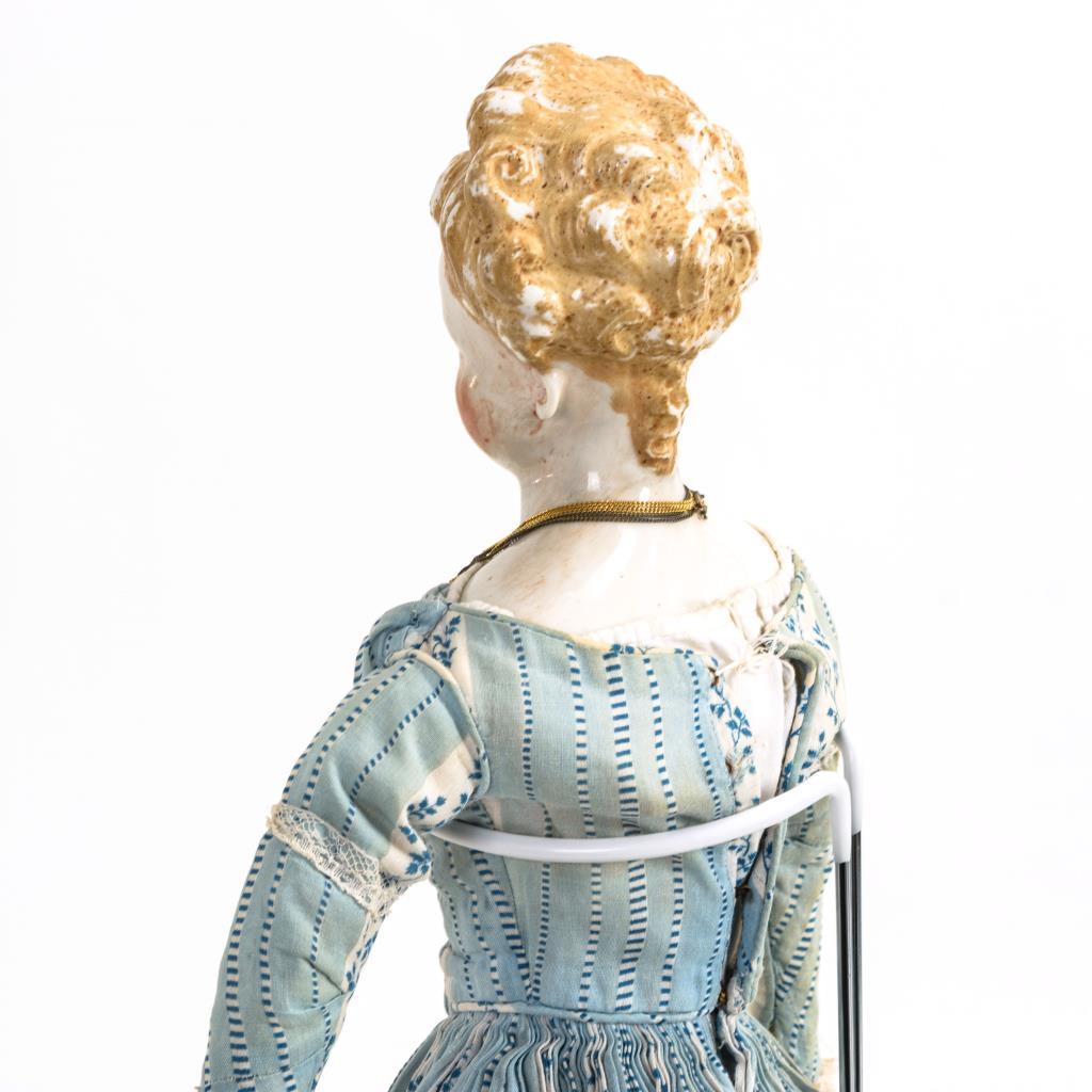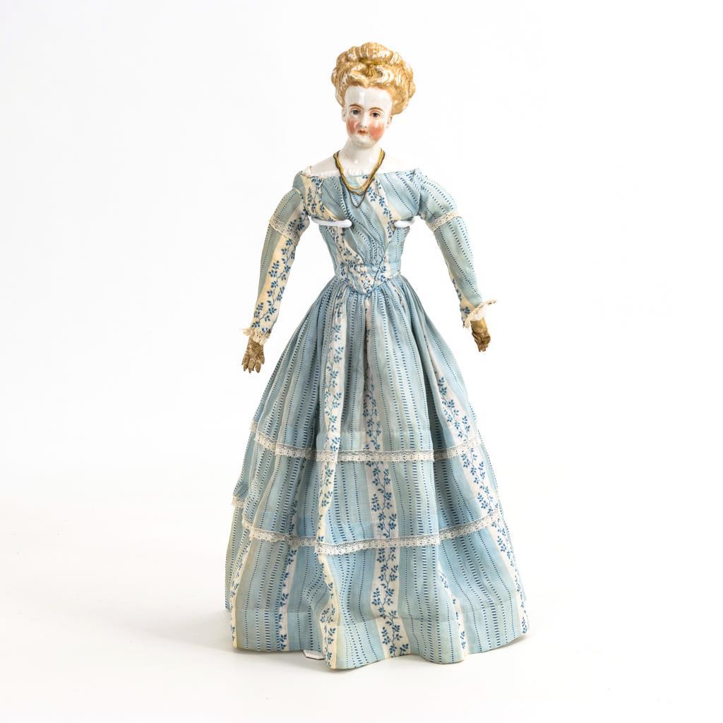 Schlanke Dame mit aufglasurbemaltem Brustkopf, blauen Augen, geschlossenem Mund, modellierten blonden Haaren, modelliertem Goldschmuck und Ohrlöchern. Lederkörper mit Handschuhhänden. Langes hellblaues Kleid, alte Lederstiefelchen. Kopfbemalung berieben, Finger mit offenen Nähten.