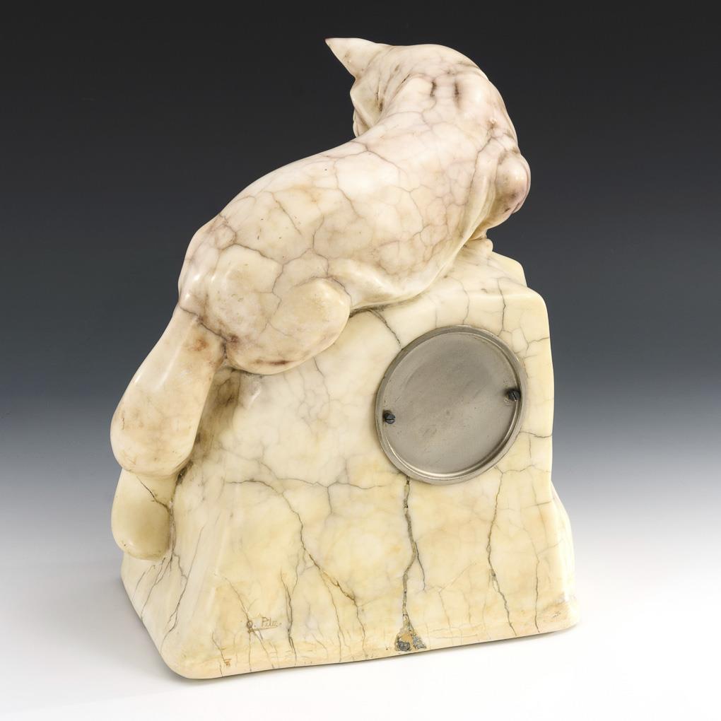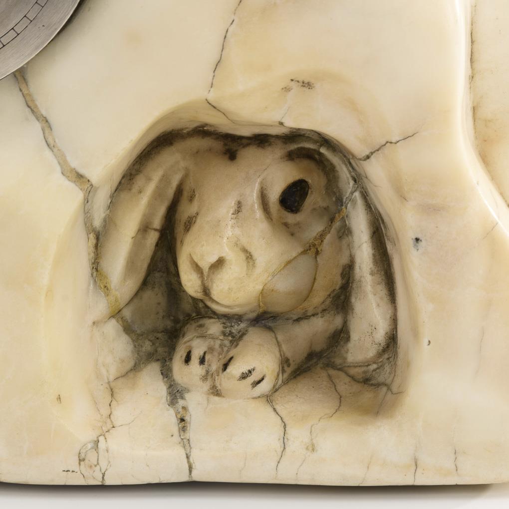 Seltene OTTO PILZ-Marmorkaminuhr mit Fuchs und Hase. LENZKIRCH.