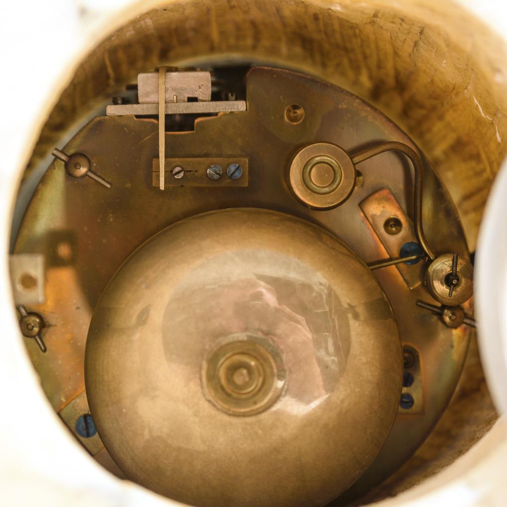 Gemarktes Federwerk mit Halbstundenschlag auf Glocke, Schlüsselaufzug, Werk wurde überholt und läuft. Versilbertes Zifferblatt mit arabischen Zahlen, Minutenkranz und Spadezeigern.