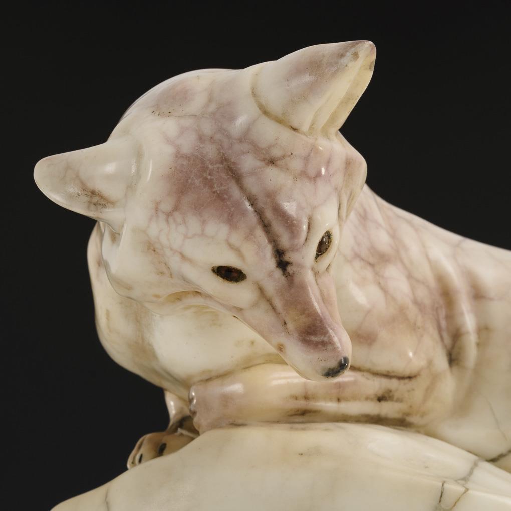 Jugendstil-Uhr als Einzelanfertigung nach einem Entwurf von Otto Pilz, in Form eines Natursockels, in dem sich ein Hase versteckt. Bekrönende Fuchsplastik in lauernder Jagdhaltung. Restauriert.