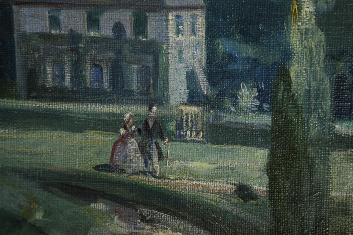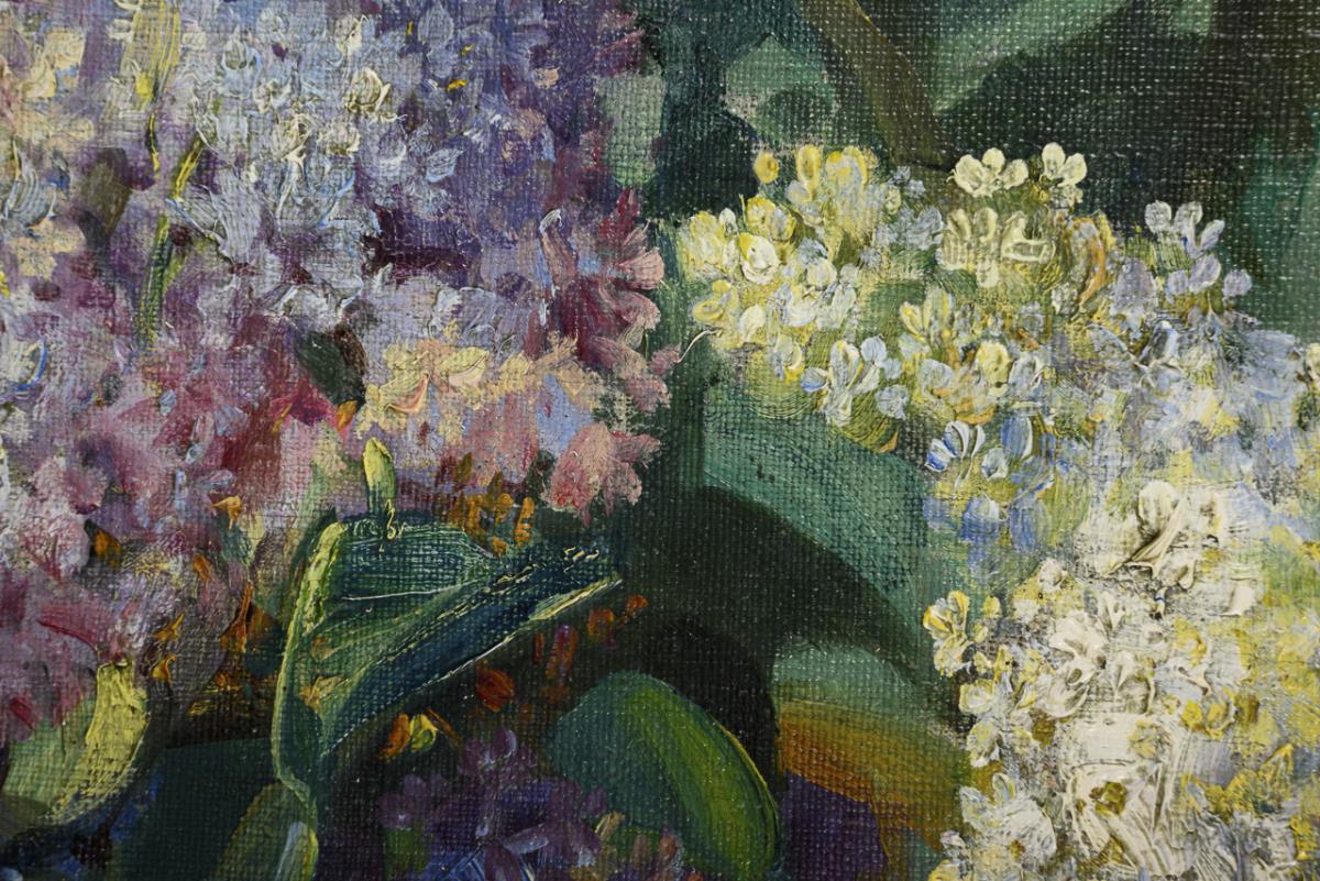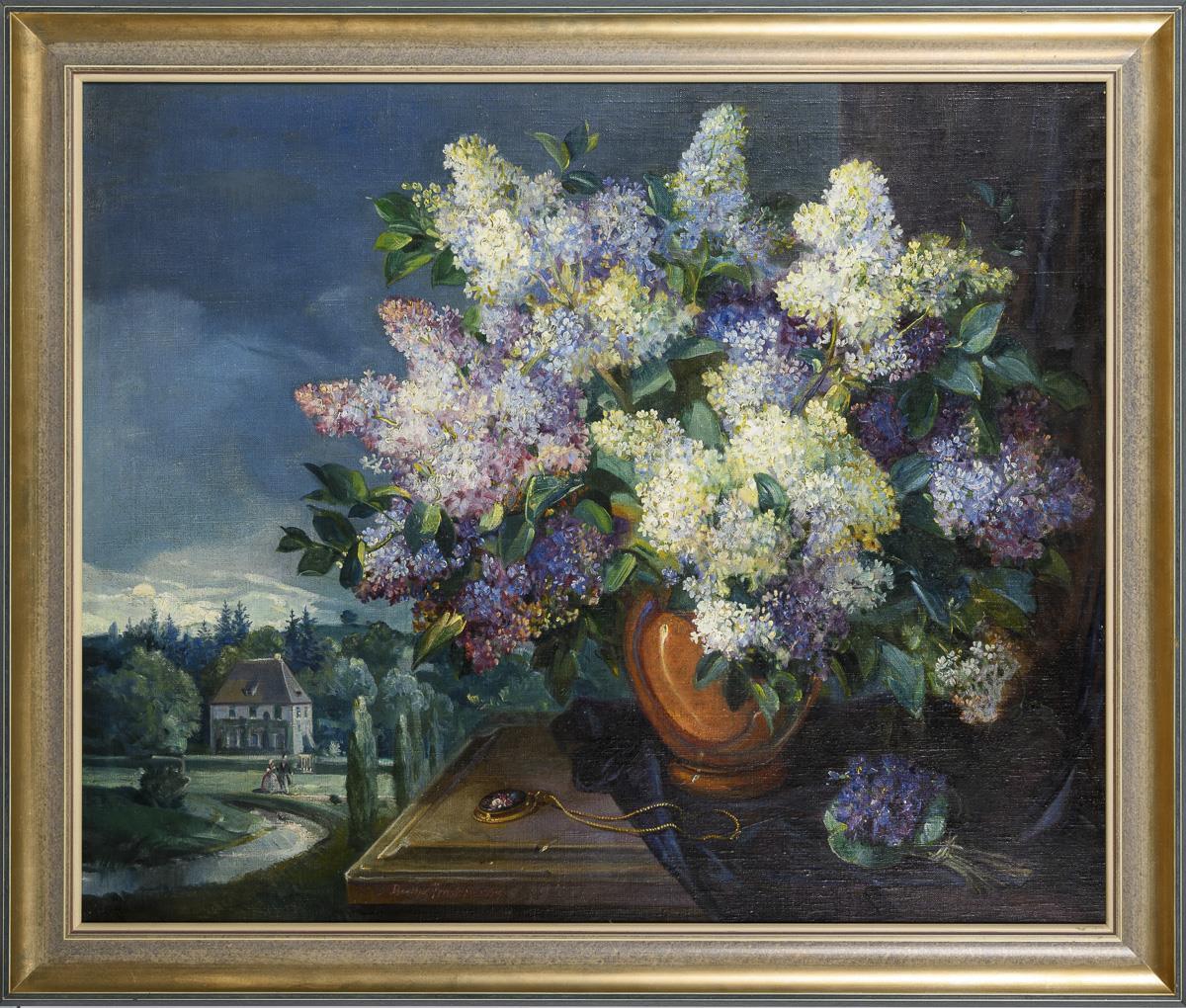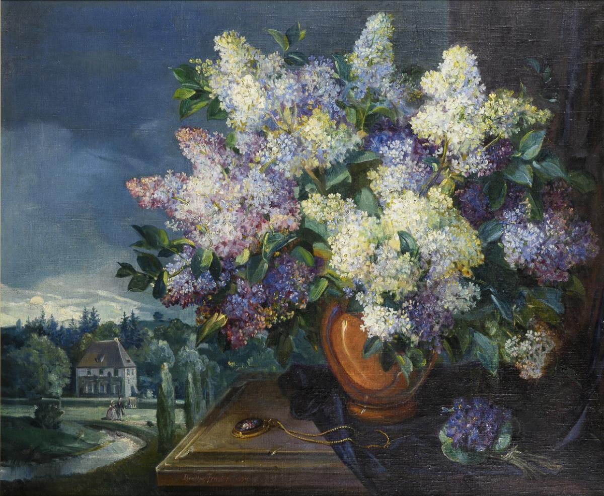 Blühender Flieder in verschiedenen Farben auf einem Sims mit Medaillon und Blick in den Park an der Ilm mit einem spazierenden Paar. Leichte Altersspuren.