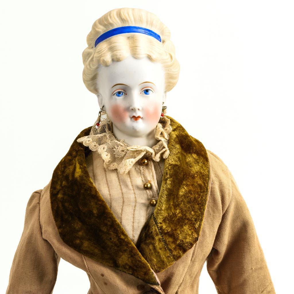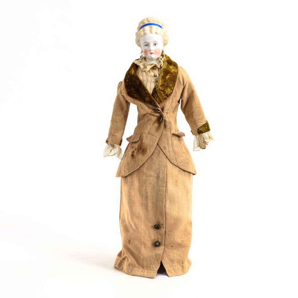 Große Puppe mit hellem Brustkopf, gemalten blauen Augen, geschlossenem Mund, Ohrringen und blauem Haarband. Schlanker Lederkörper. Beigefarbenes Kostüm mit Samtkragen. Körper mit Altersspuren. Kleidung verschmutzt, 1 Schuh fehlt.