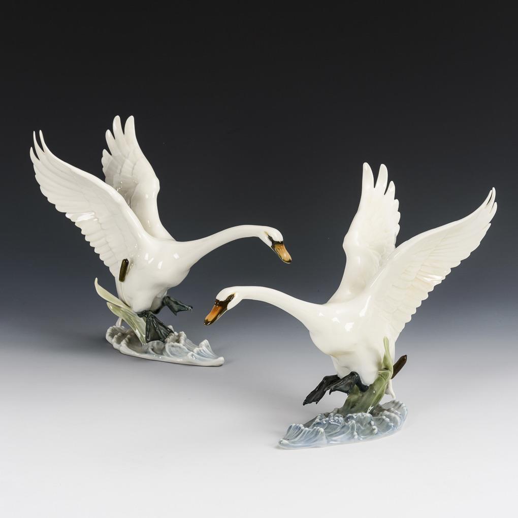 2 gleiche Plastiken eines über Wellen fliegenden Schwanes. 1 Kralle minimal bestoßen.