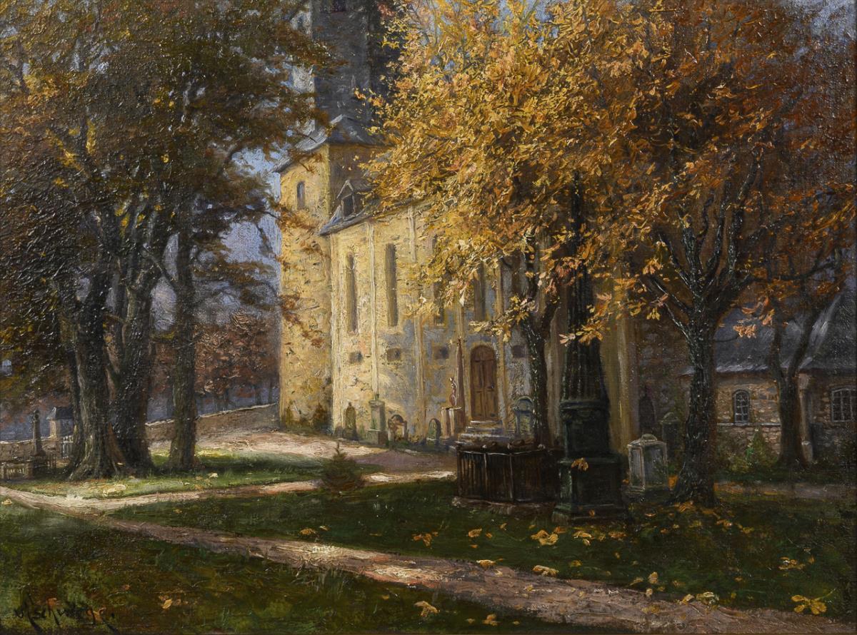 Die Kirche im Sonnenschein mit herbstlichen Bäumen unter blauem Himmel. Leinwand doubliert.