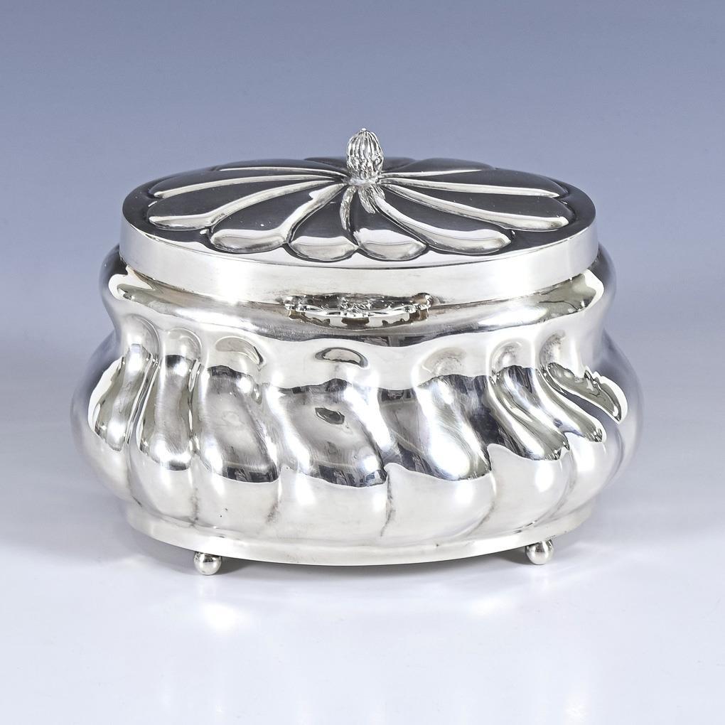 Ovale, godronierte Dose auf 4 Kugelfüßen. Gebrauchsspuren, kleine Dellen.