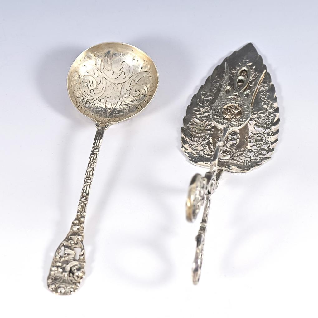 2 Durchbruchschälchen, Gebäckzange und Sahnelöffel.
