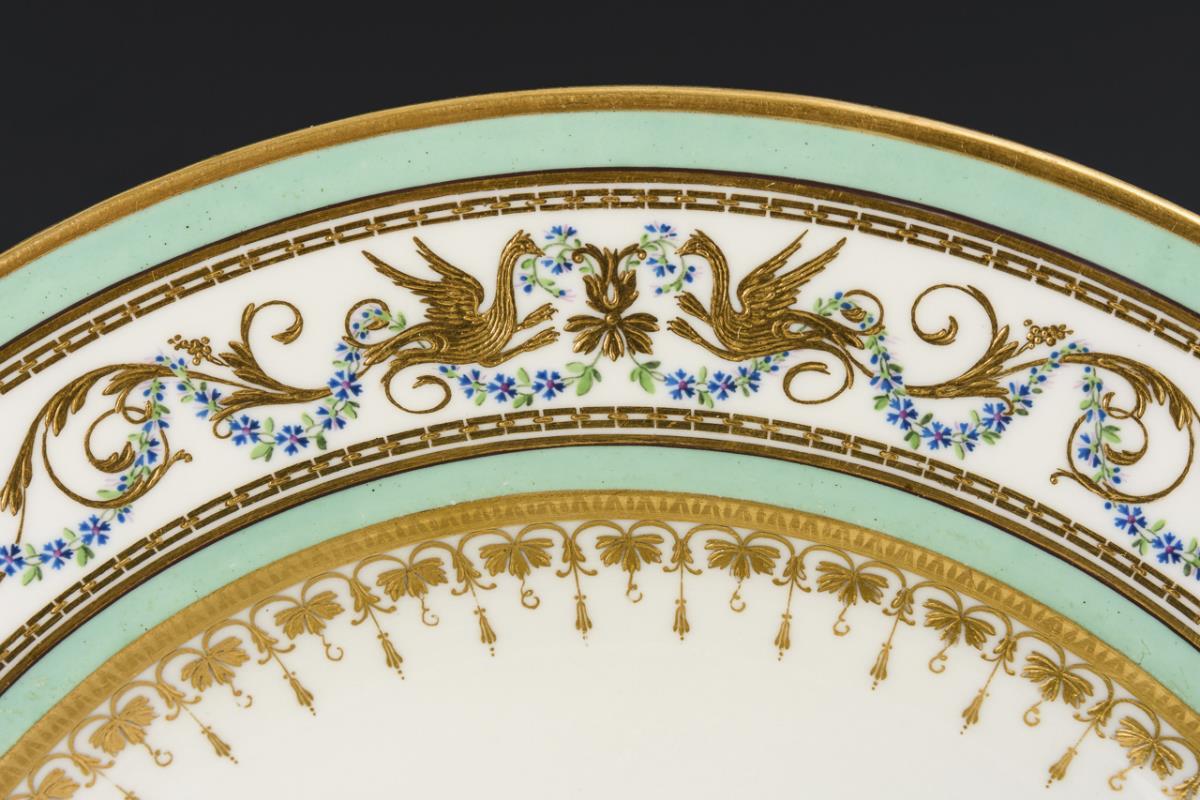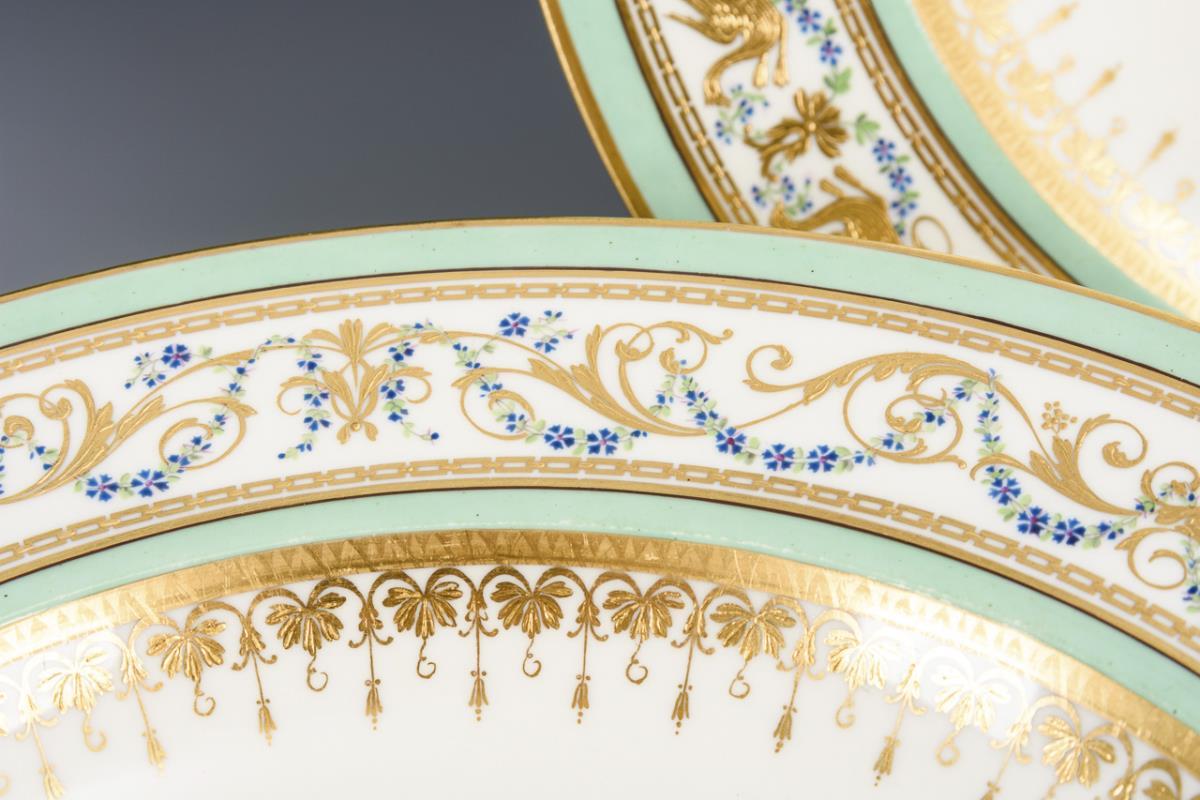 2 fein bemalte Suppenteller. Auf der Fahne mintgrüne Fondbänder, zwischen goldenen Mäanderbändern reliefgoldgemalte Grotesken, umwunden von Kornblumenfestons, in der Kehle ein reliefgoldgemaltes Palmettenband. 1x Bestoßung am Standring.