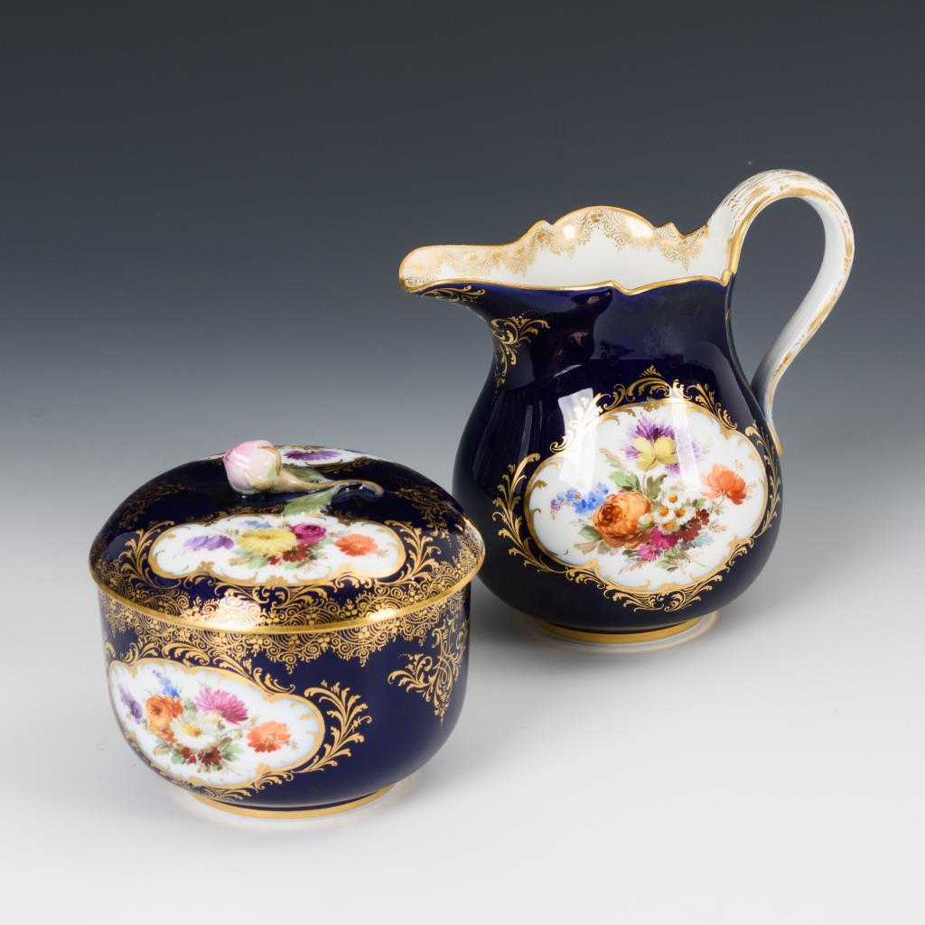 Kobaltblauer Fond, polychrome Malerei, Goldstaffage.Zuckerdose (H 10 cm) und Milchkännchen (H 14 cm).