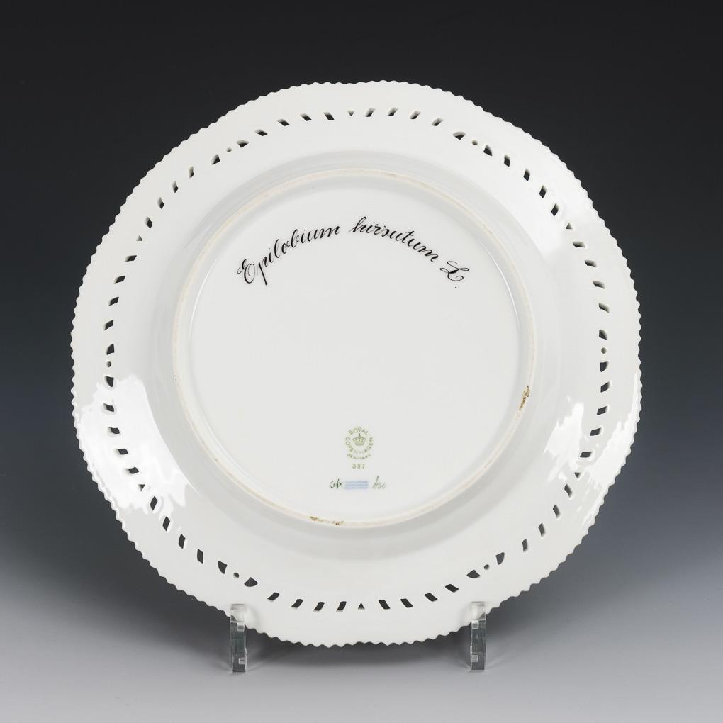 Teller mit durchbrochener Fahne und Zackenrand. Im Spiegel die Darstellung des Zottigen Weidenröschens, unterseitig lateinisch bezeichnet.