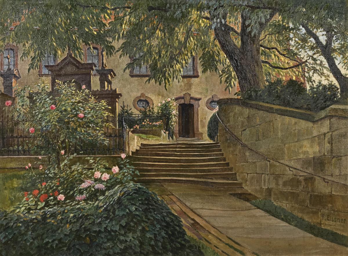 Blühender Rosengarten neben der Treppe vor dem hohen Gebäude im Sonnenschein.