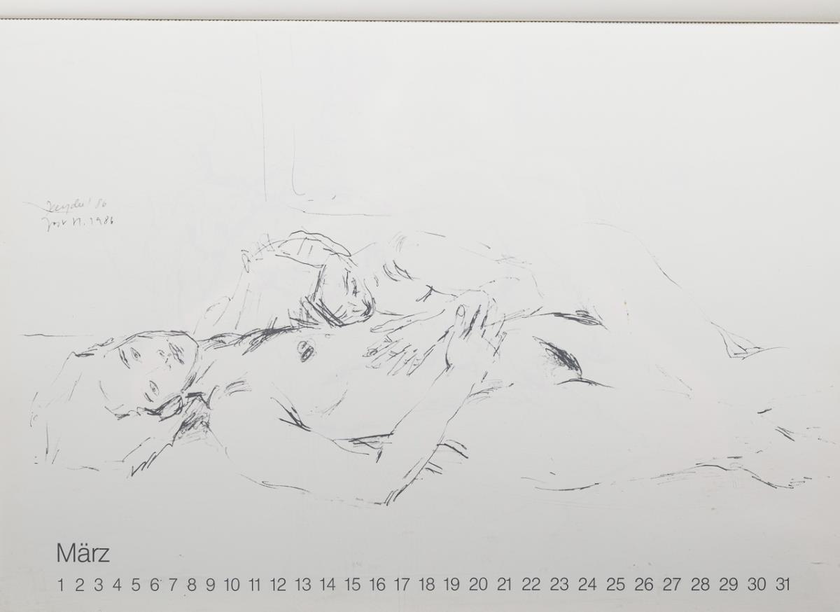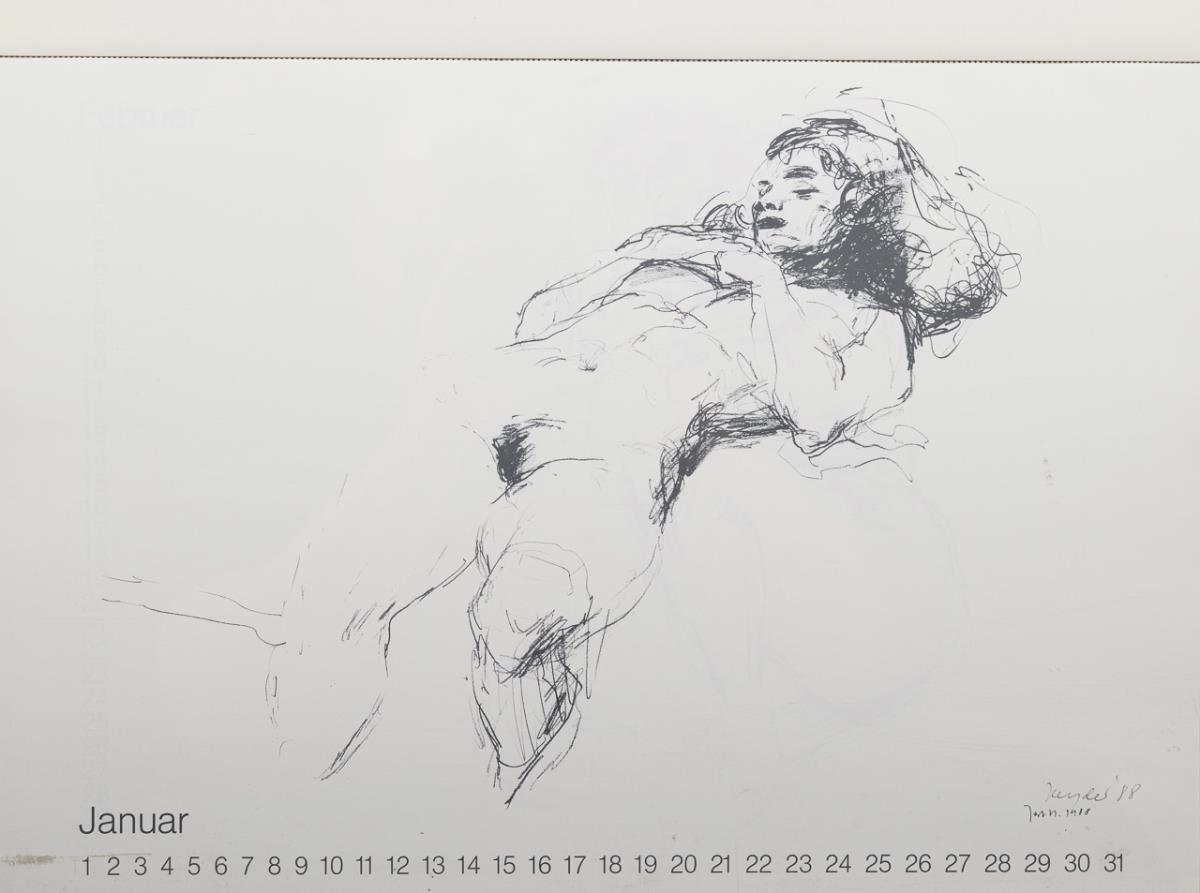 Vollständiger, individuell einsetzbarer Kalender mit abreißbaren Monatsblättern mit weiblichen Akten. Einband leicht verschmutzt.