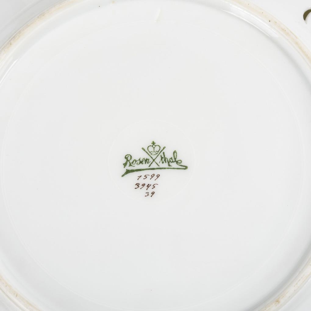 Fünfpassige Teller mit geschweiften Liniendurchbrüchen auf der Fahne. Im Spiegel jeweils die im Stil der Weichmalerei ausgeführte Darstellung eines Zweiges mit Früchten. Minimaler Goldabrieb.