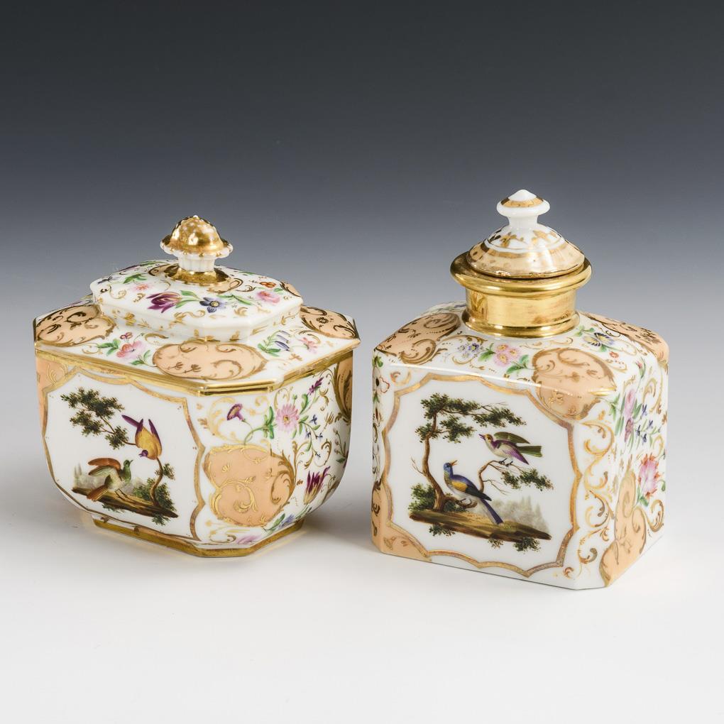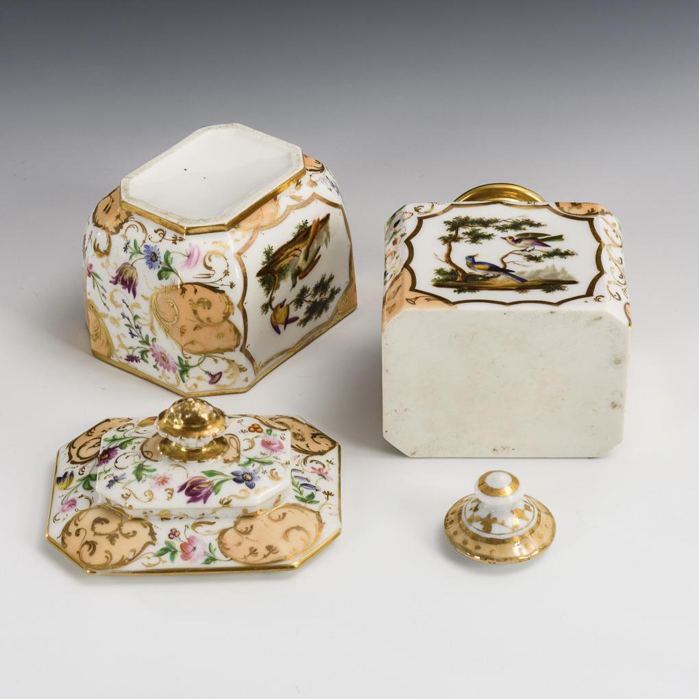 Rechteckige Form mit angeschnittenen Ecken. Reiche vegetabile Goldmalerei mit lachsfarbenen Fondfeldern und Blumenmalerei, beidseitig die Darstellung von exotischen Vögeln. Partieller Goldabrieb, Teedosendeckel ergänzt.