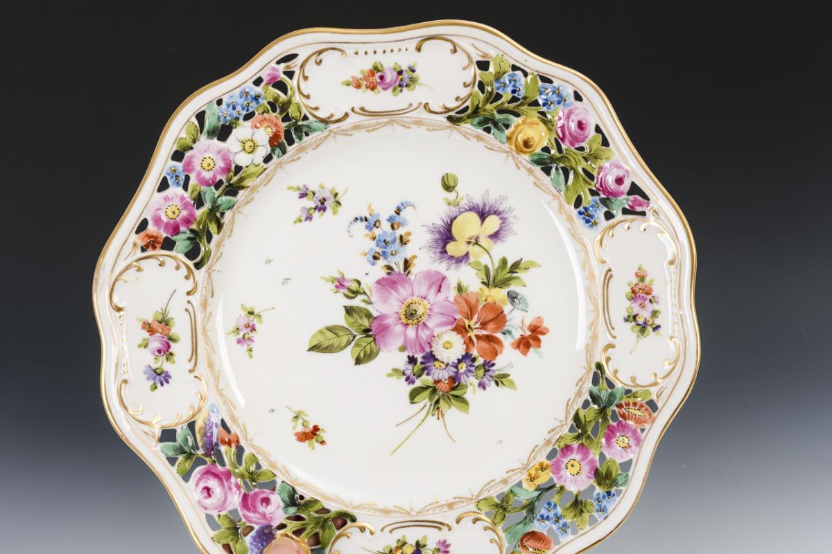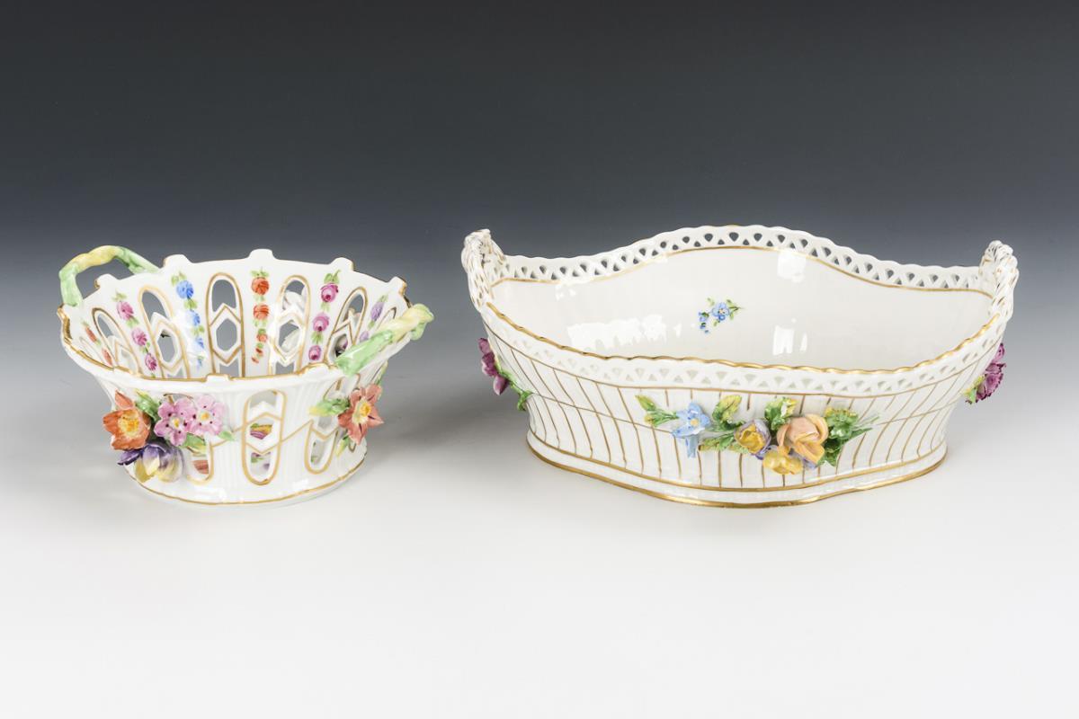 4 verschiedene Teller mit Blüten- bzw. Gitterdurchbruch und Blumenmalerei (Ø 1x 26 cm und 3x ca. 22,5 cm). 1 oval-vierpassiger Korb (L 24,5 cm) und 1 runder Korb (Ø 17,5 cm) mit Blütenbelag und Blumenmalerei. 1 Teller mit Randhaarriss, partiell Bestoßungen am Belag.