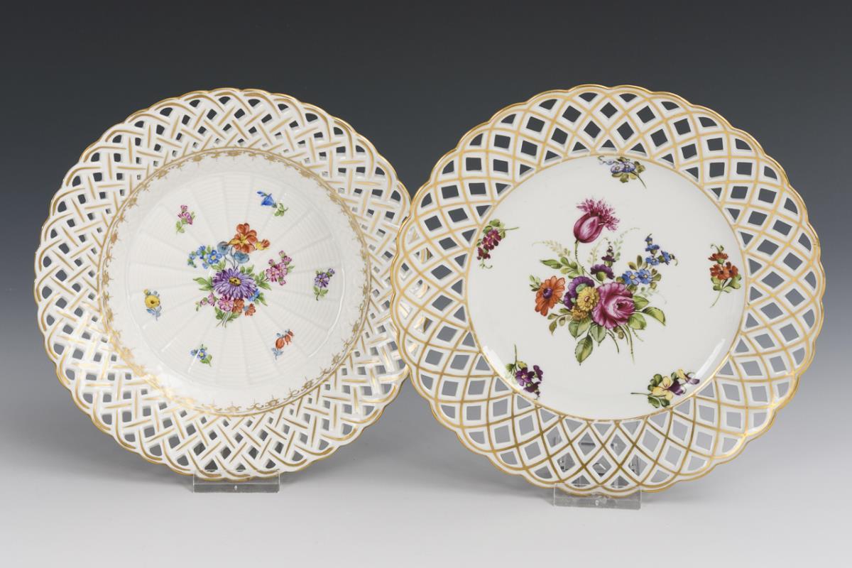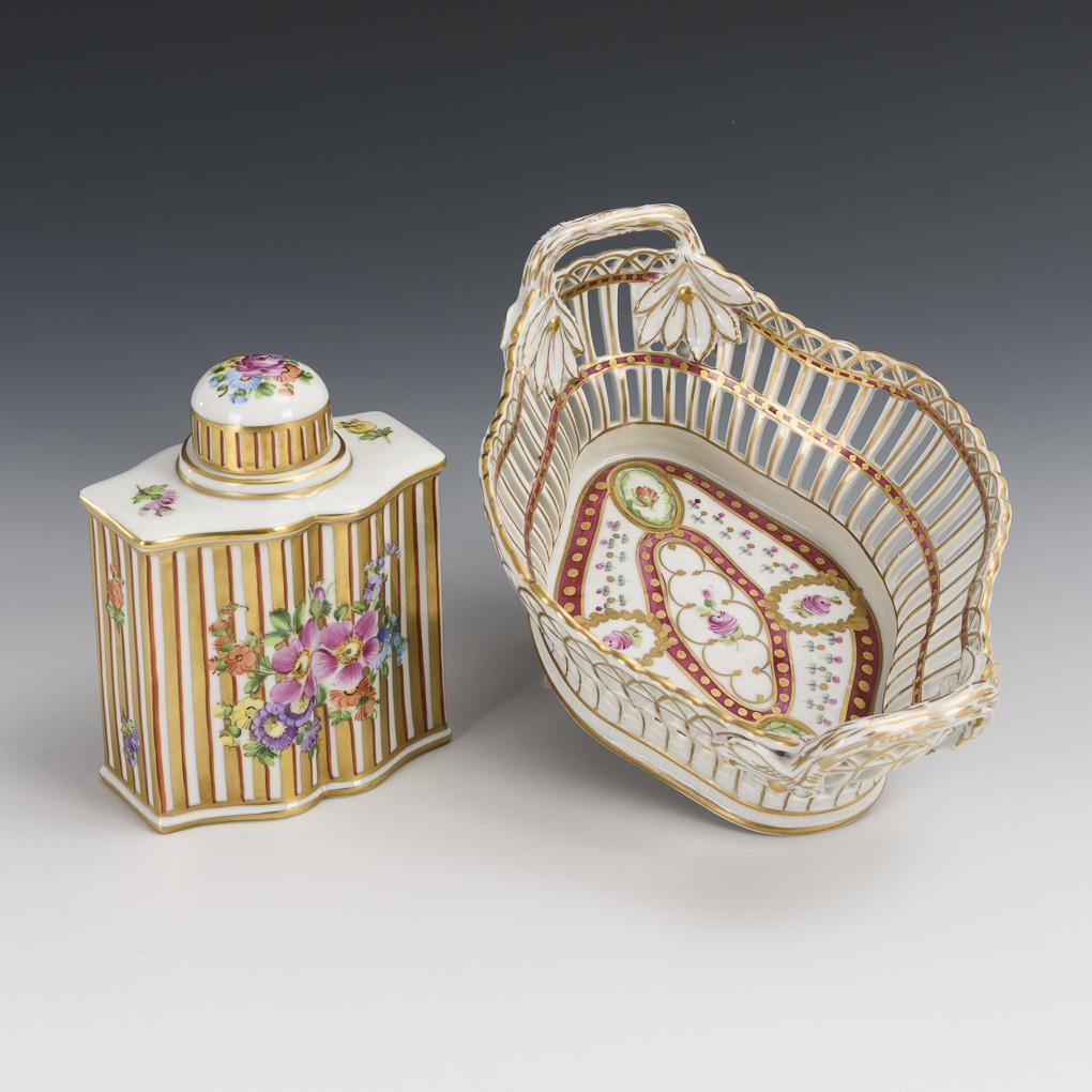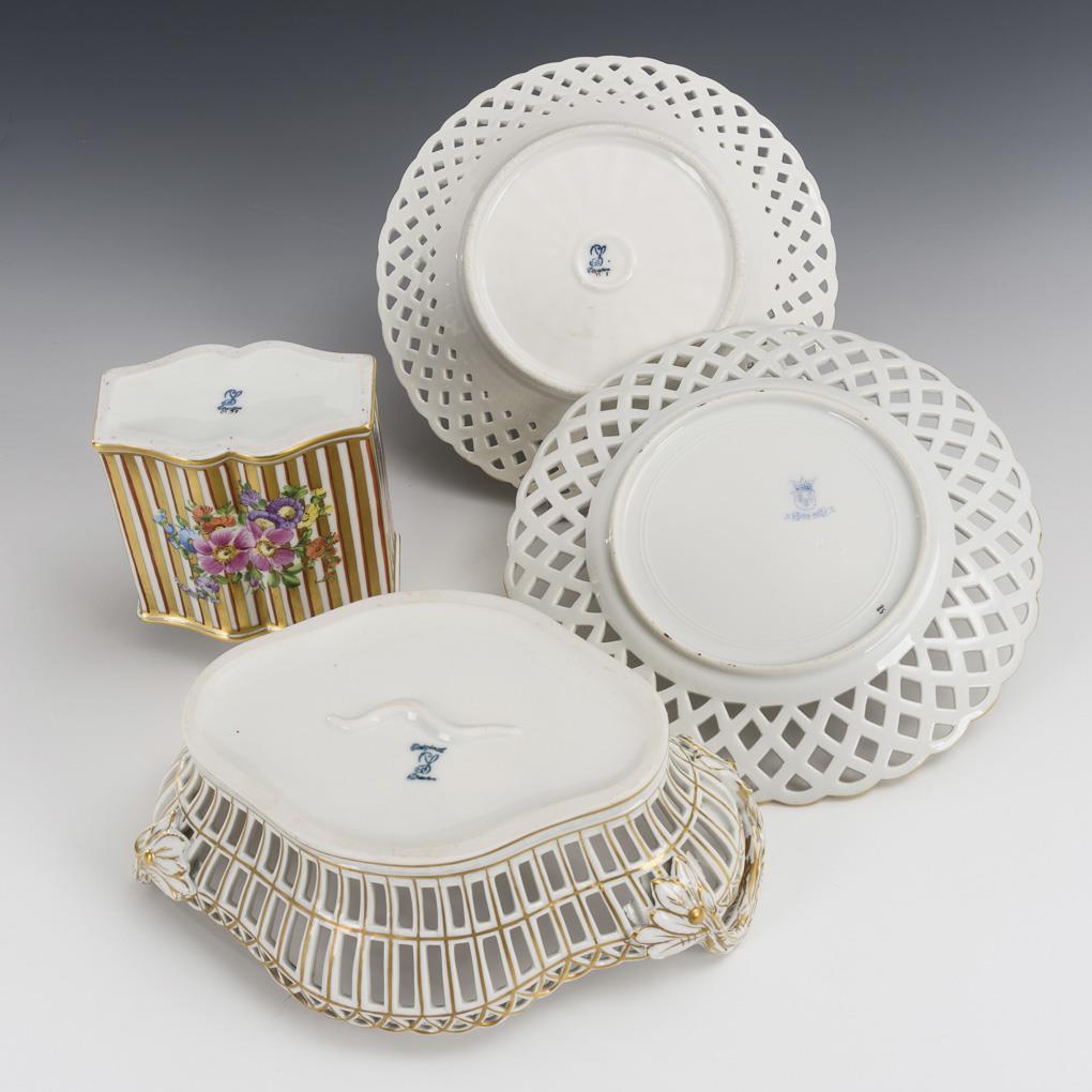 Oval-vierpassiger Durchbruchkorb mit zwei Handhaben (L 21,5 cm), 2 verschiedene Durchbruchteller (Ø 18,5 und 20 cm), passig geschweifte Teedose (H 13 cm).